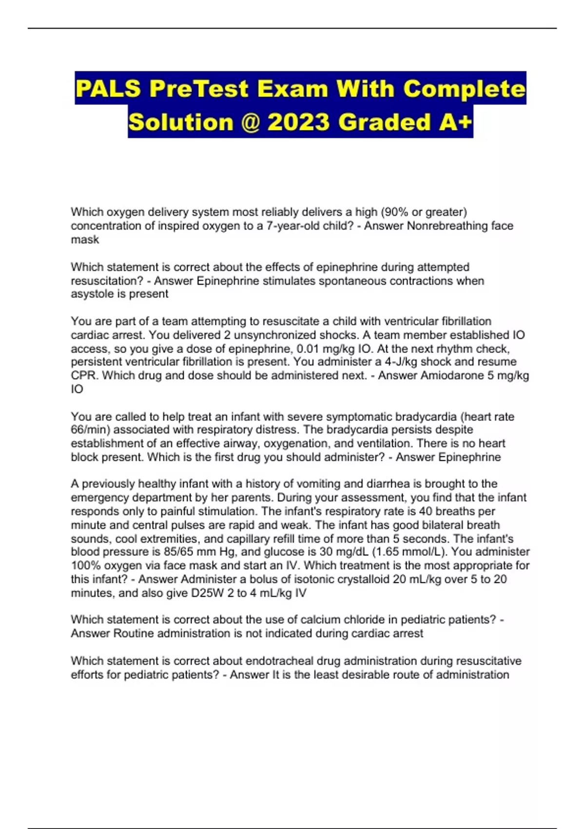 PALS PreTest Exam With Complete Solution @ 2023 Graded A+