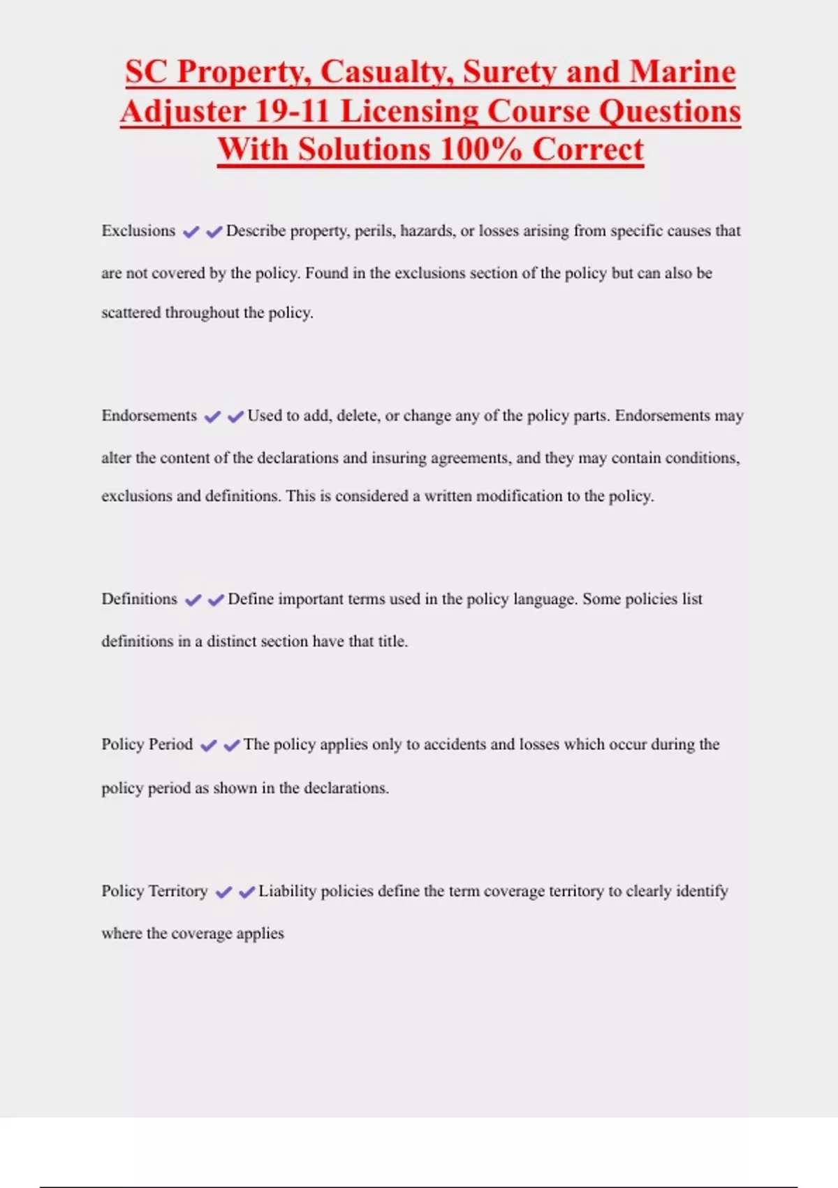 SC Property, Casualty, Surety and Marine Adjuster 19-11 Licensing Course Questions With Solutions 100% Correct