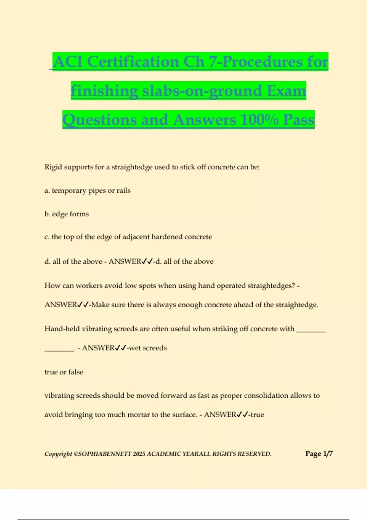 ACI Certification Ch 7-Procedures for finishing slabs-on-ground Exam Questions and Answers 100% Pass