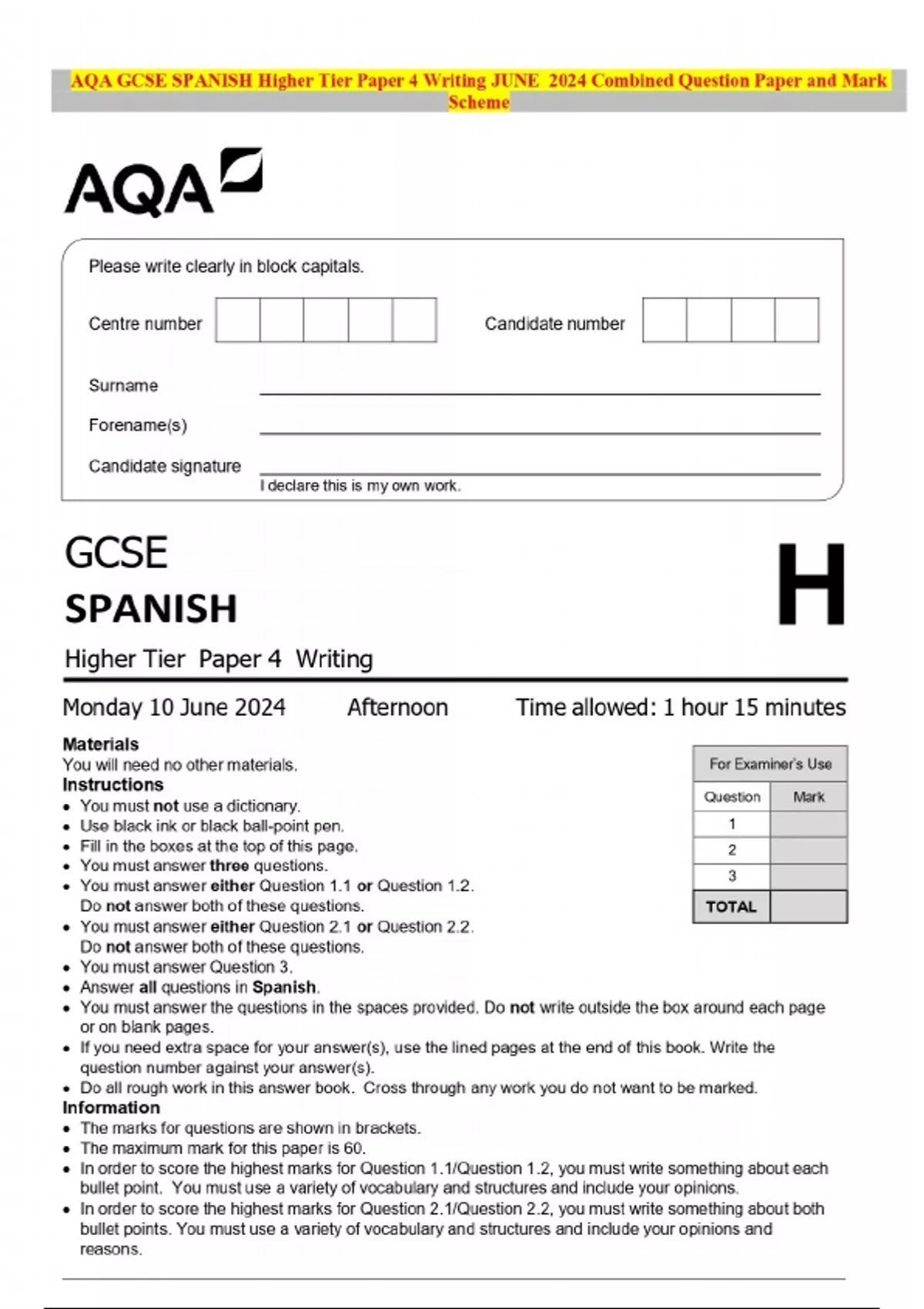 BUNDLE::: AQA GCSE SPANISH Higher Tier 2024 Combined Question Paper and Mark Scheme