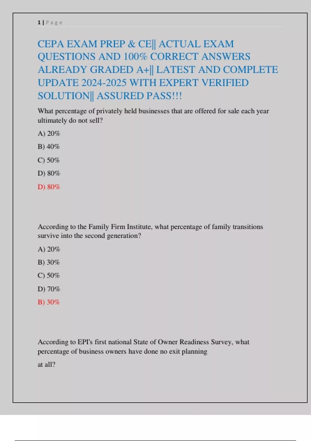 CEPA EXAM|| CEPA EXAM PREP & CE|| CEPA- CERTIFIED EXIT PLANNING ADVISOR PREP EXAM|| EPI EXAM-PREP GUIDE FOR CEPA EXAM|| 2024–2025 QUESTIONS AND 100% CORRECT ANSWERS ALREADY GRADED A+|| LATEST AND COMPLETE UPDATE WITH VERIFIED SOLUTIONS|| ASSURED