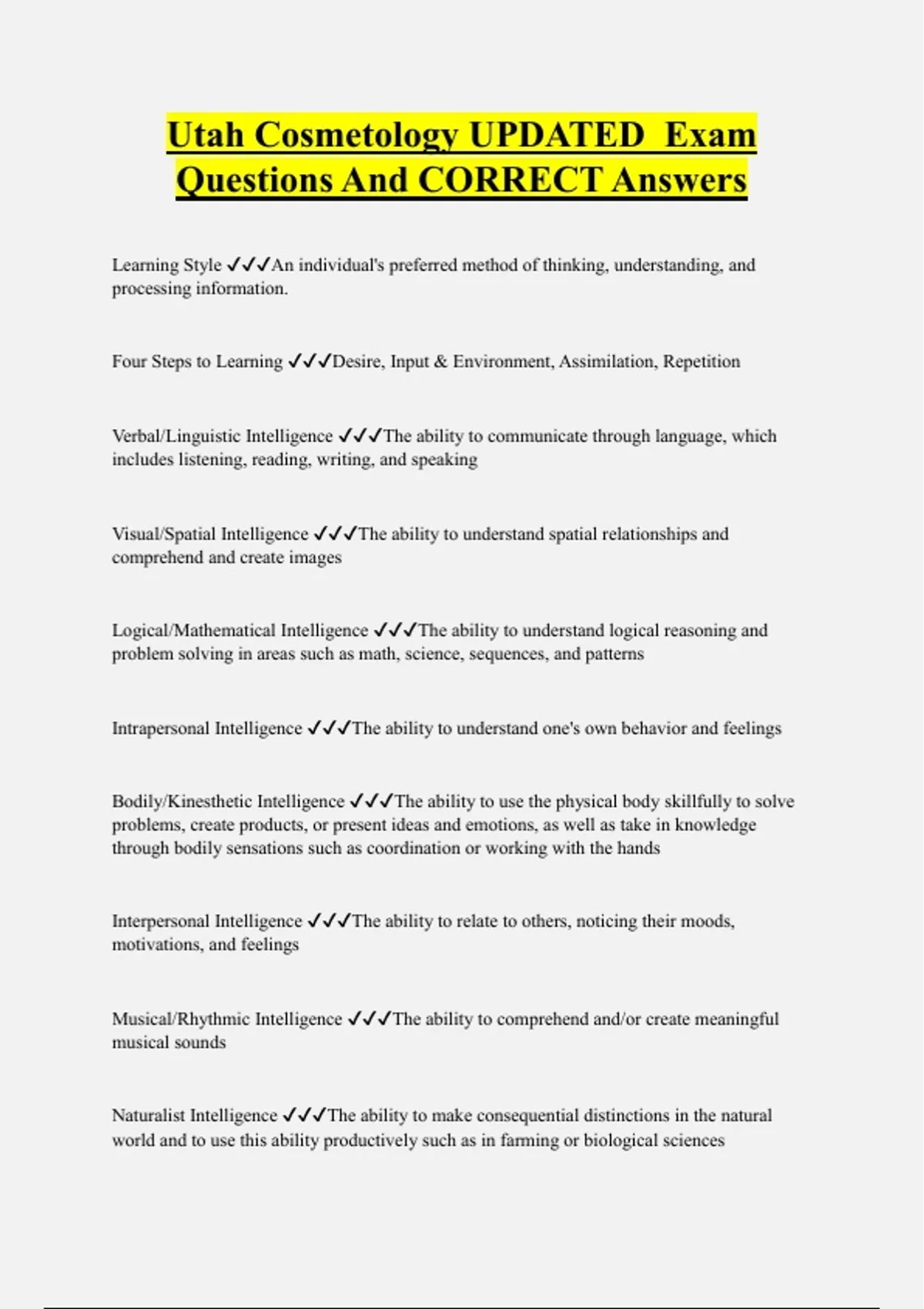 UTAH COSMETOLOGY Bundled Exam Questions and CORRECT Answers