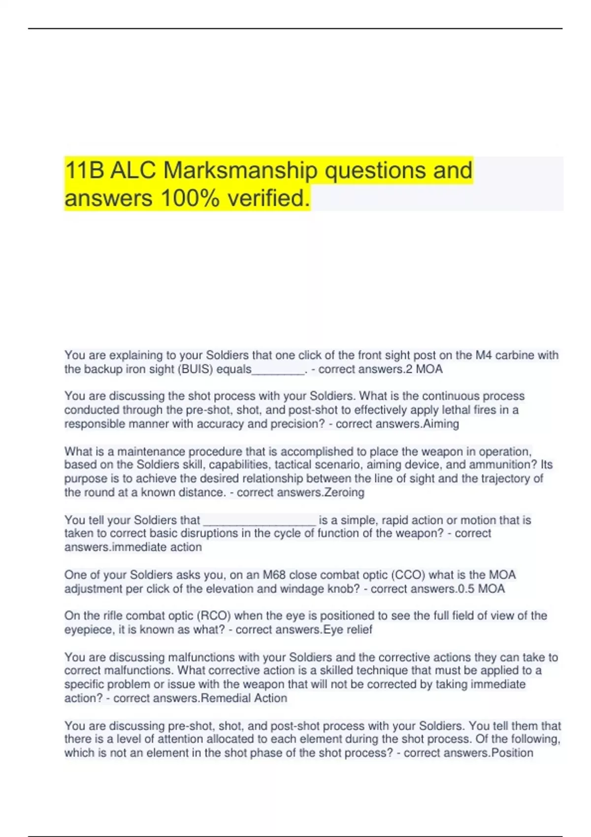 11B ALC Marksmanship questions and answers 100% verified.11B ALC – Tactics Questions And Answers 100% Guaranteed Success.11B ALC Tactics Exam Questions And Answers Latest Top Score.11B ALC Tactics Questions And Answers 100% Verified.