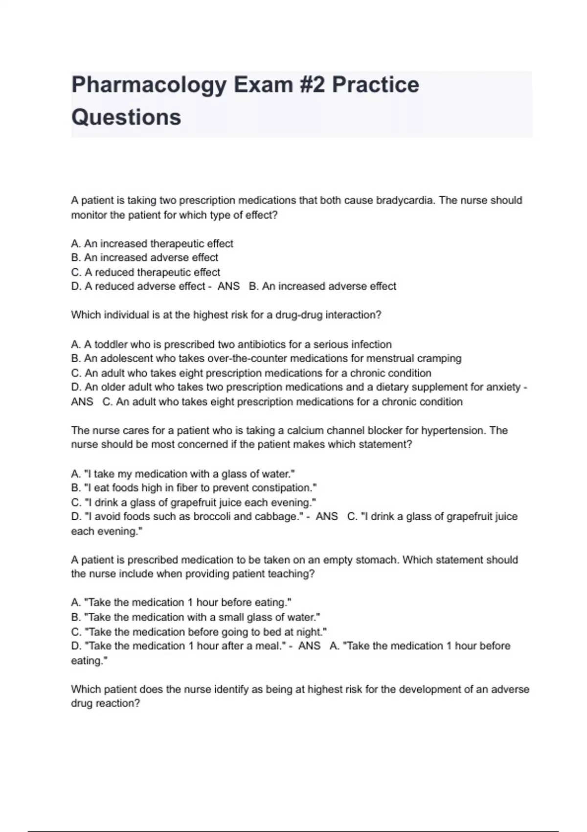 Pharmacology Exam #2 Practice Questions And Answers