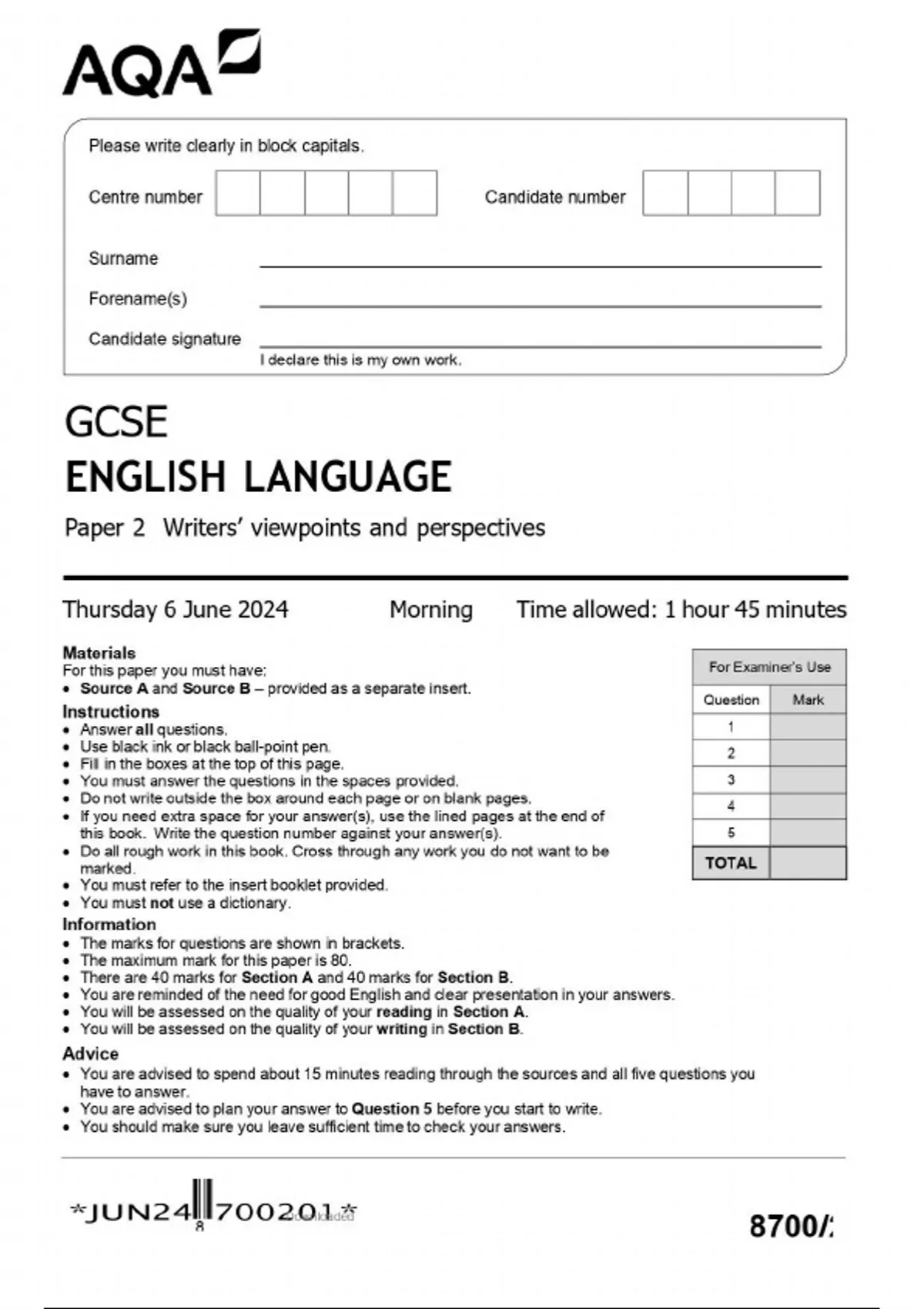GCSE AQA JUNE 2024 ENGLISH LANGUAGE PAPER 2 MARK SCHEME. GCSE AQA JUNE 2024 ENGLISH LANGUAGE PAPER 2 INSERT SHEET . GCSE AQA JUNE 2024 ENGLISH LANGUAGE PAPER 2.