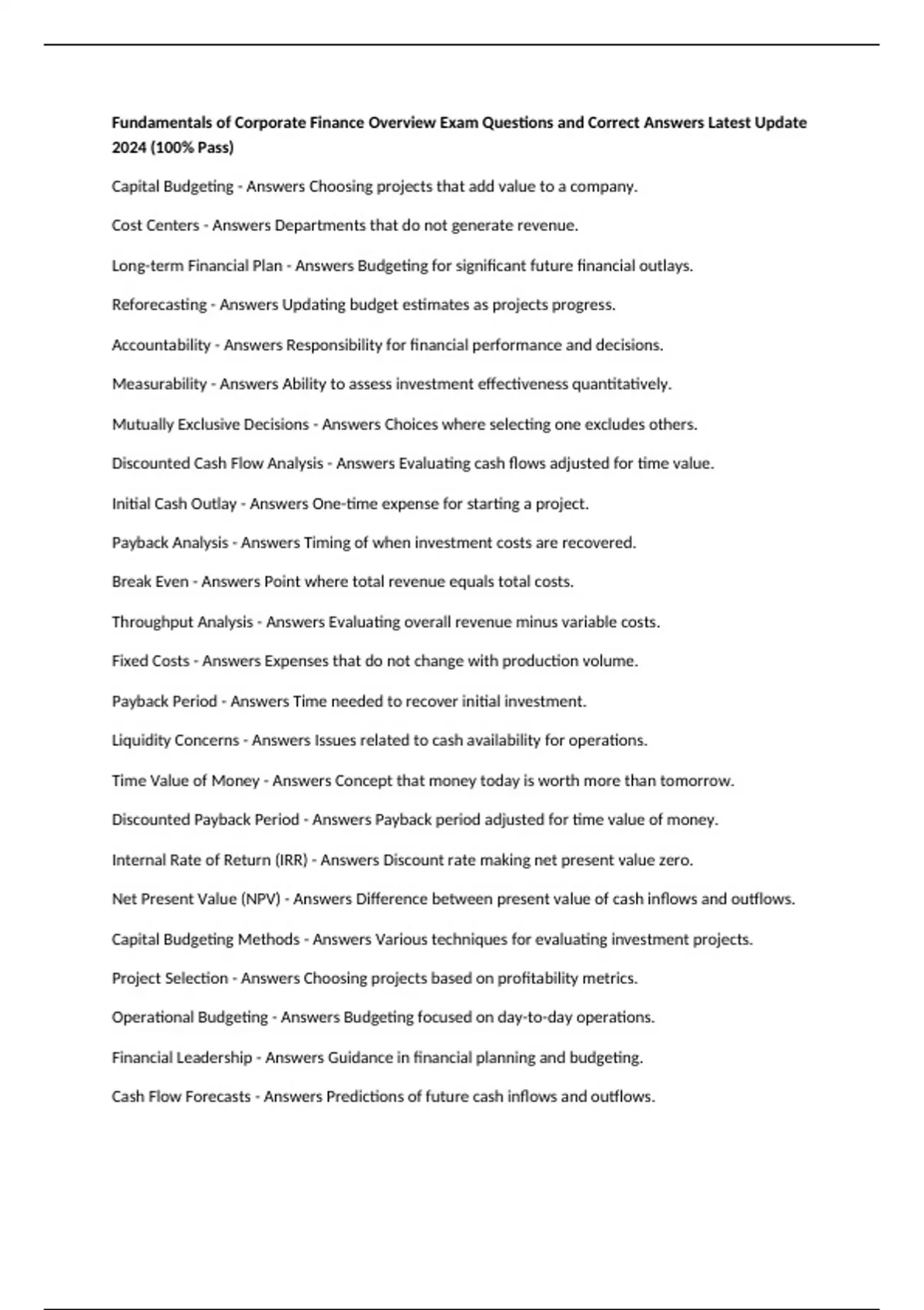 Fundamentals of Corporate Finance Overview Exam Questions and Correct Answers Latest Update 2024 (100% Pass)