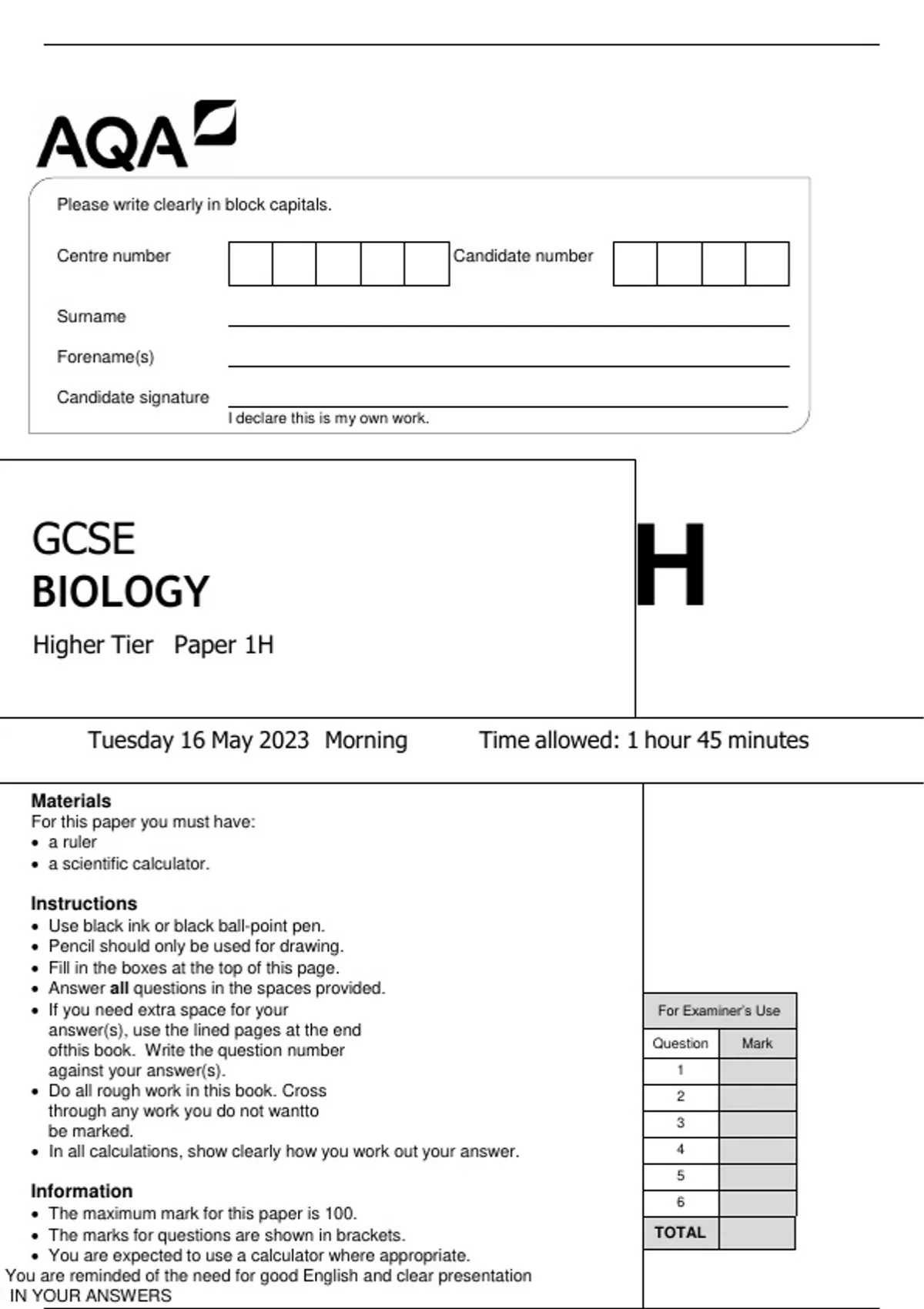 GCSE AQA MAY 2024 HIGHer tier BIOLOGY PAPER 1
