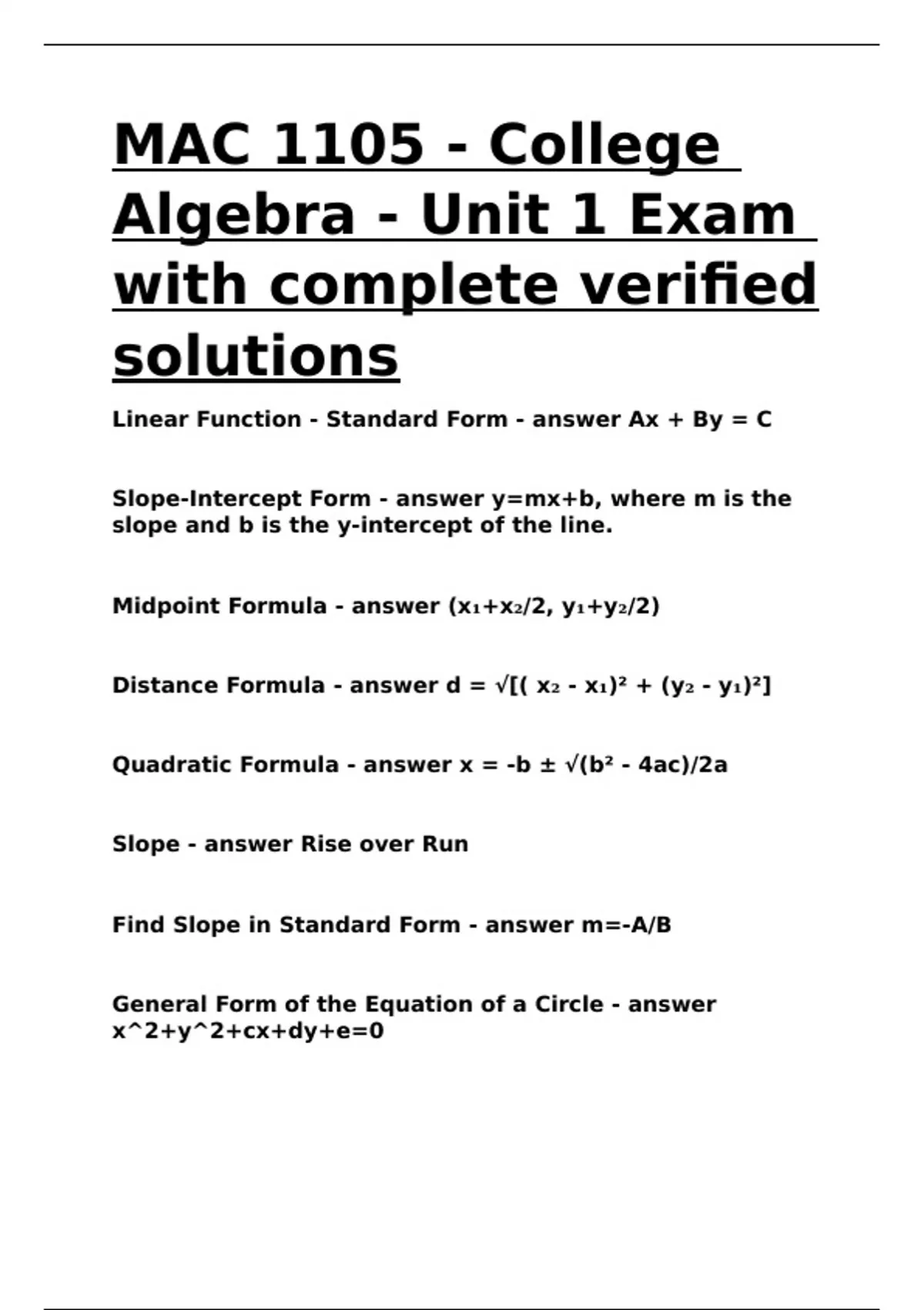 MAC 1105 - College Algebra - Unit 1 Exam with complete verified solutions