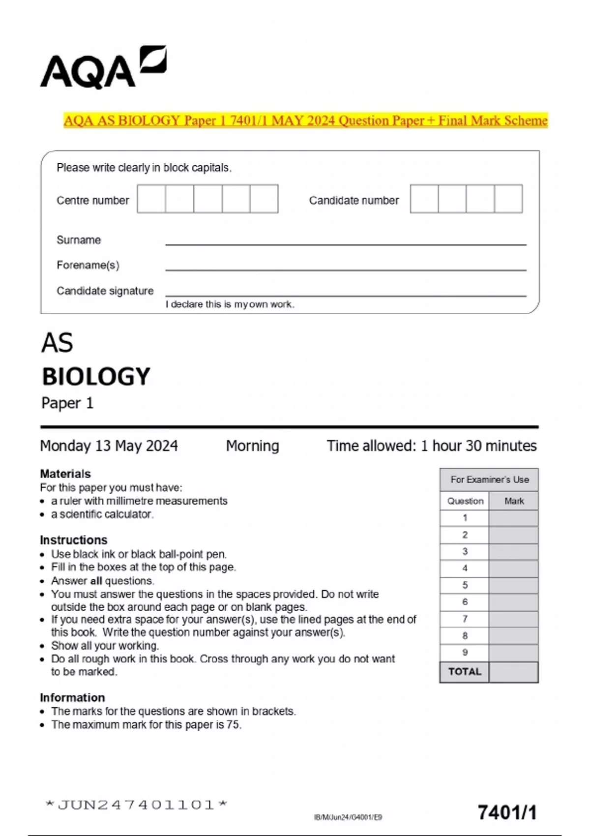 AQA AS BIOLOGY Paper 1 7401/1 MAY 2024 Question Paper + Final Mark Scheme