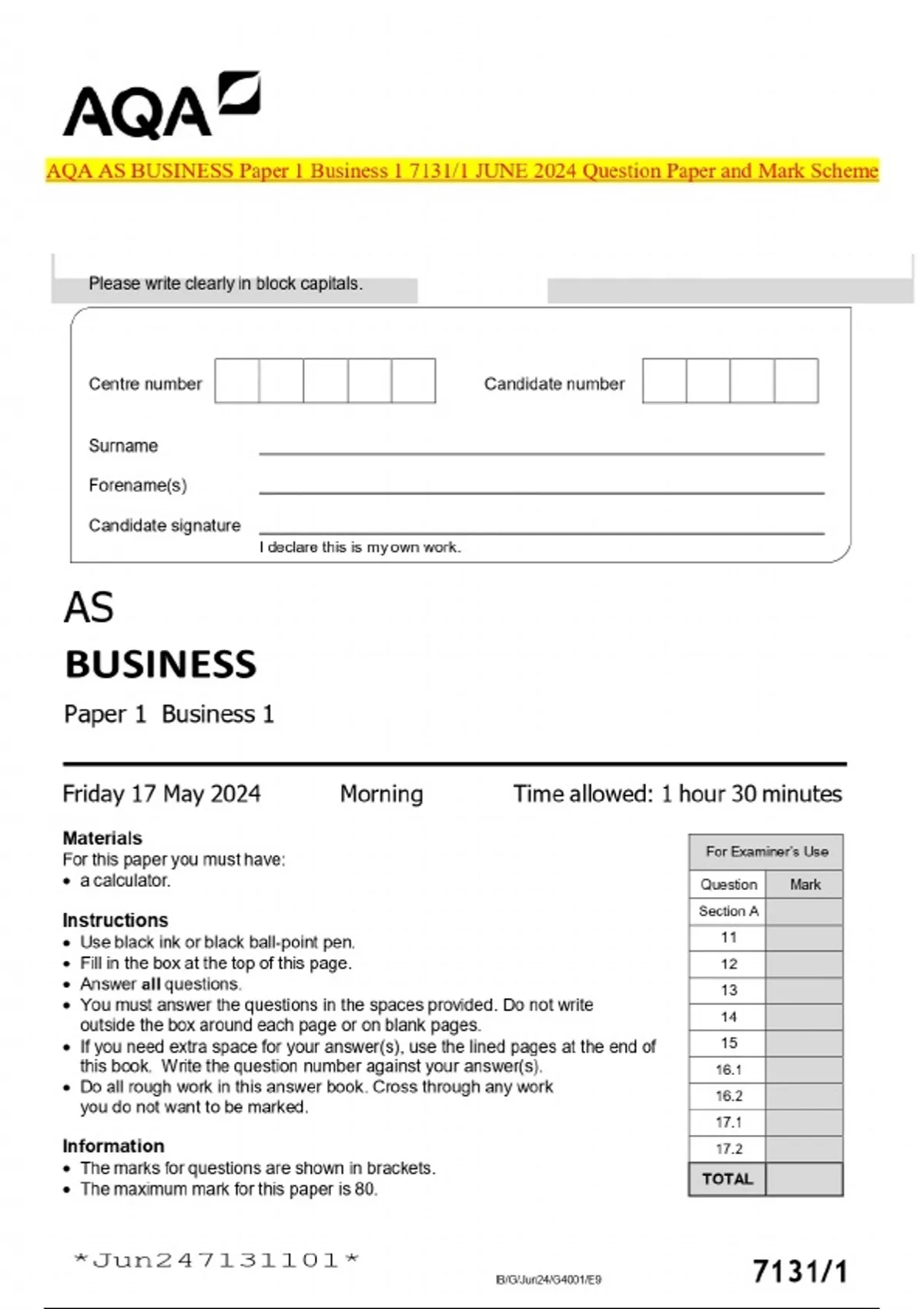 AQA AS BUSINESS Paper 1 Business 1 7131/1 JUNE 2024 Question Paper and Mark Scheme