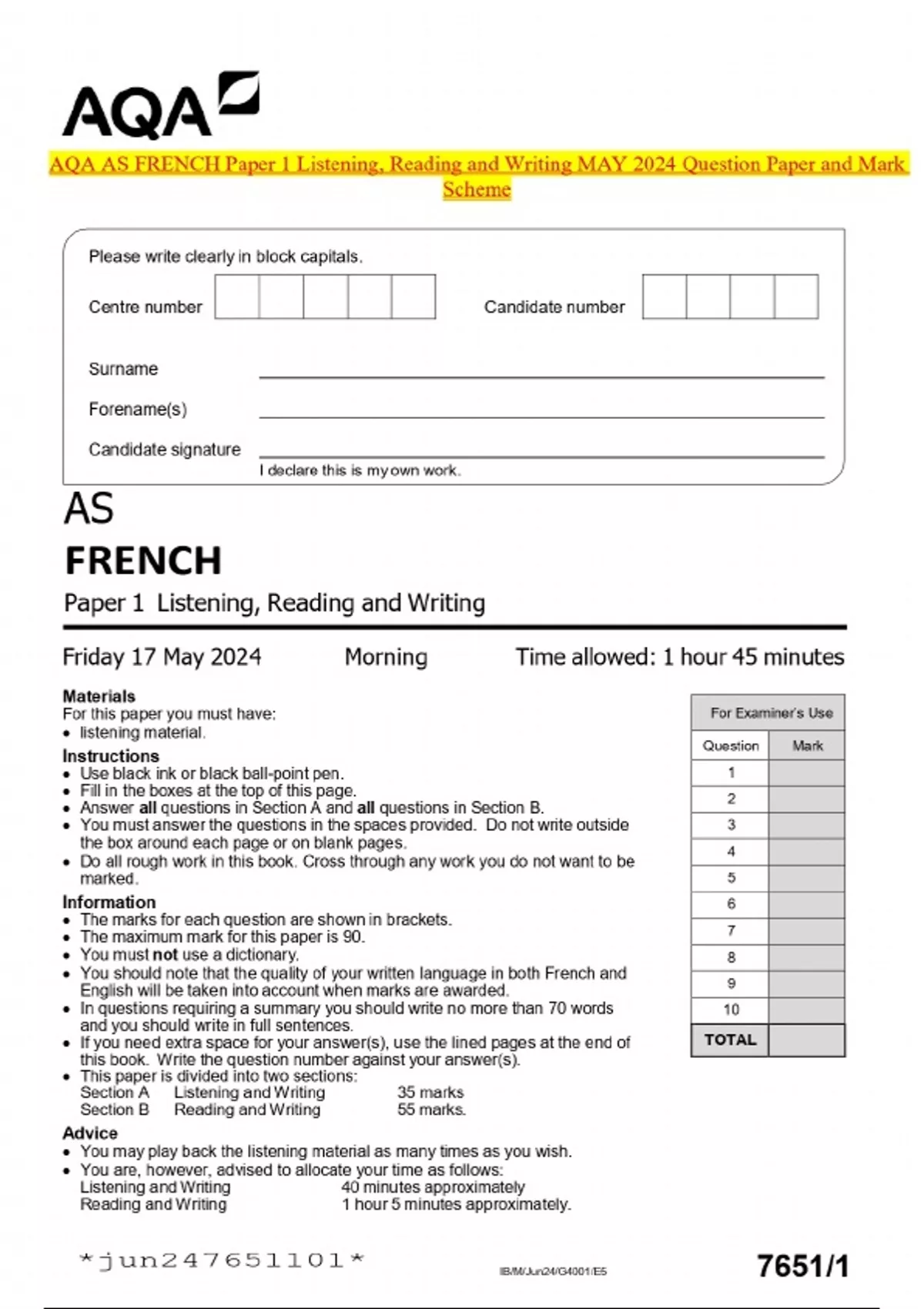 AQA AS FRENCH Paper 1 Listening, Reading and Writing MAY 2024 Question Paper and Mark Scheme