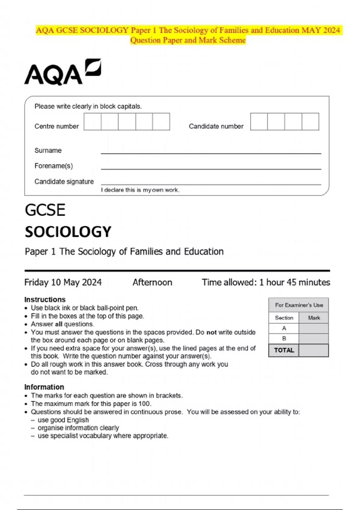 AQA GCSE SOCIOLOGY Paper 1 The Sociology of Families and Education MAY 2024 Question Paper and Mark Scheme