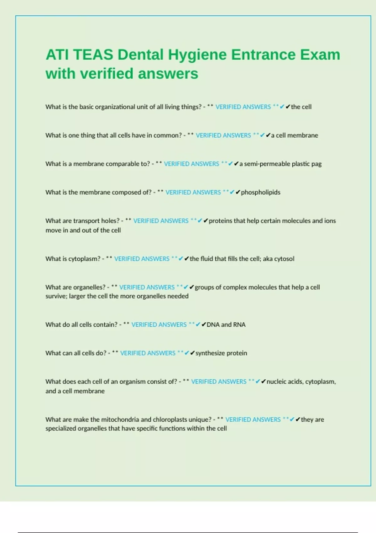 ATI TEAS Dental Hygiene Entrance Exam with verified answers