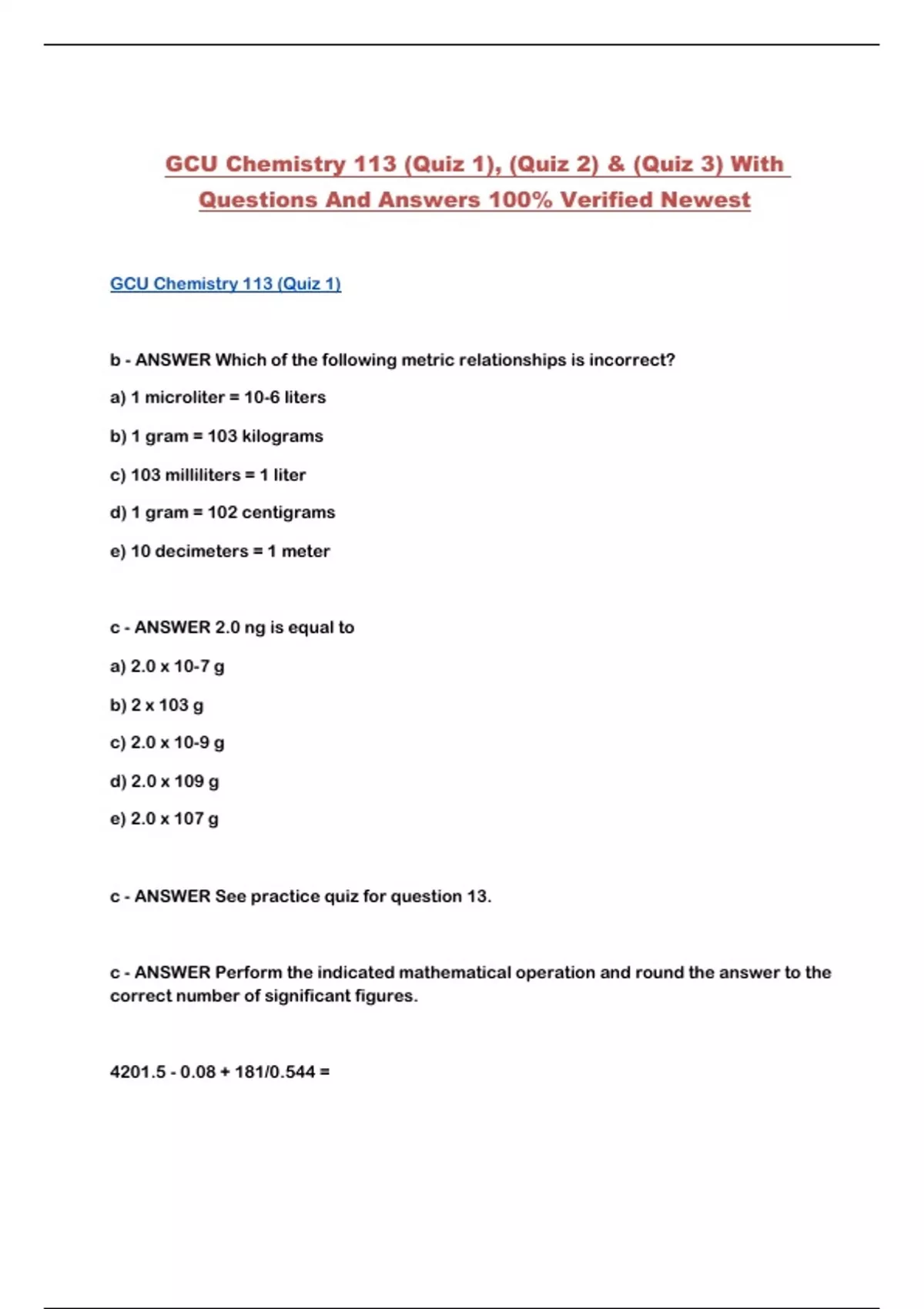 GCU Chemistry 113 (Quiz 1), (Quiz 2) & (Quiz 3) With Questions And Answers 100% Verified Newest