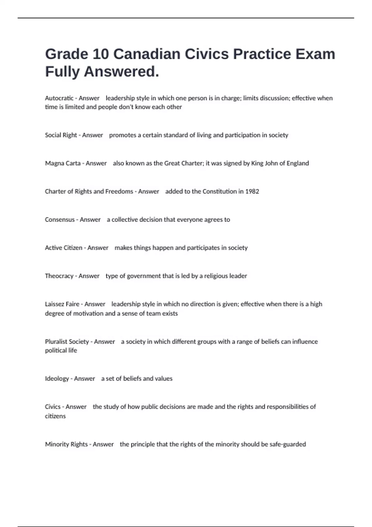 1 Exam (elaborations) High School Civics Test Review Questions And 100% Correct Answers. 2 Exam (elaborations) Grade 10 Canadian History Exam Study Questions And 100% Correct Answers. 3 Exam (elaborations) Grade 10 Canadian Civics: Unit 1 test review Questions Solved Correctly. 4 Exam (elaborations) Grade 10 Canadian Civics Unit 2 Test Review Qu