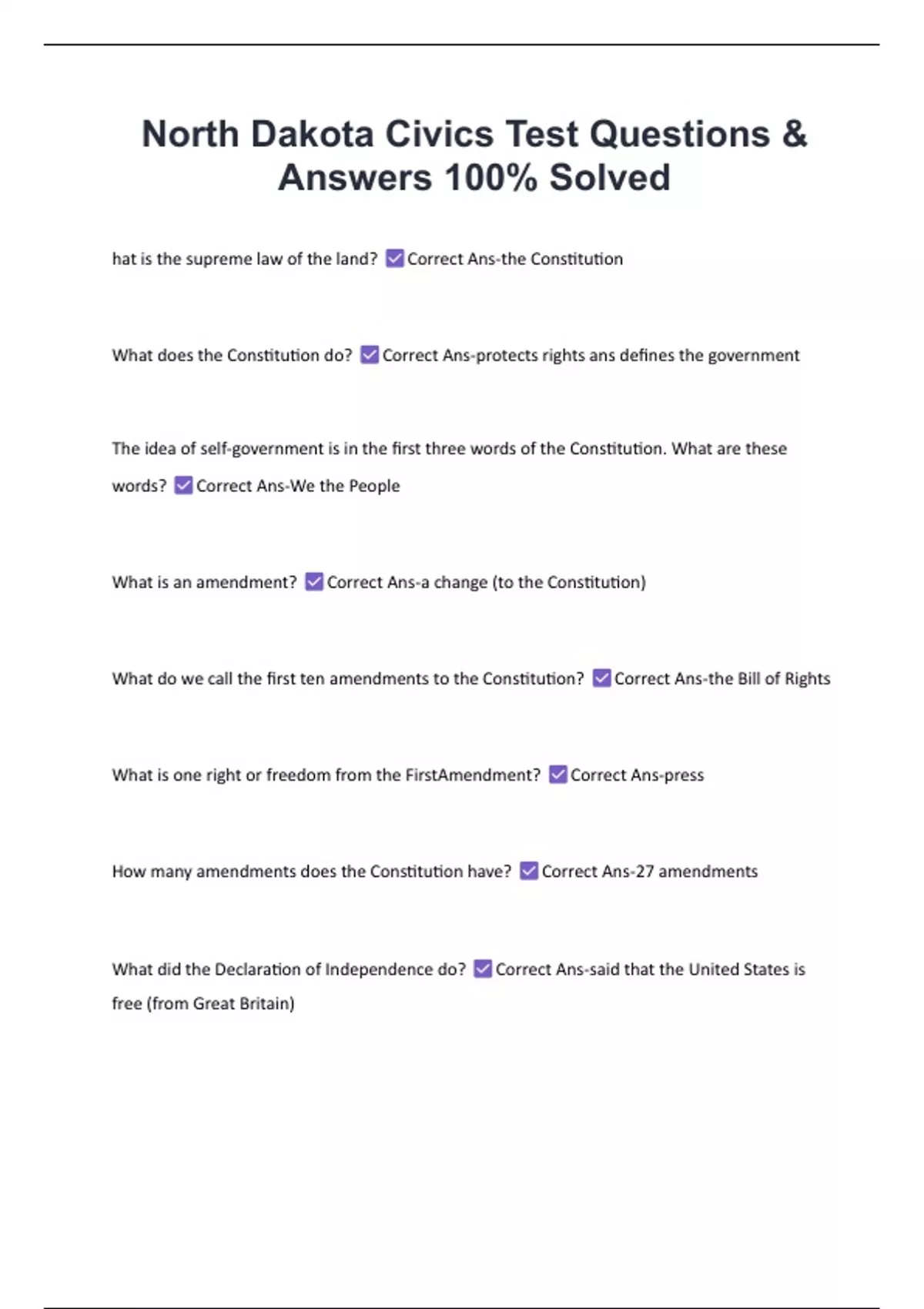 North Dakota Civics Test Questions & Answers 100% Solved 2 Exam (elaborations) North Dakota Crop Insurance Exam with Complete Solutions 3 Exam (elaborations) North Dakota Barber Exam with Verified Solutions 4 Exam (elaborations) North Dakota State Law (Cosmetology)- Test Questions & Answers 5 Exam (elaborations) North Dakota cosmetology theory-