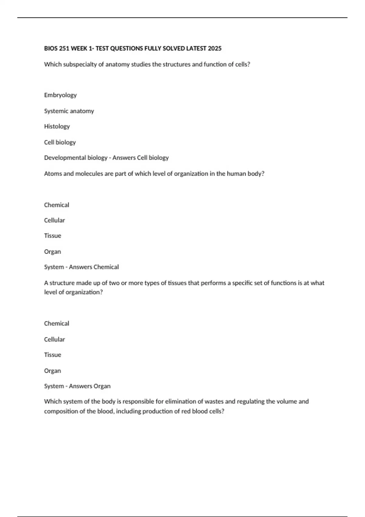 BIOS 251 WEEK 1- TEST QUESTIONS FULLY SOLVED LATEST 2025