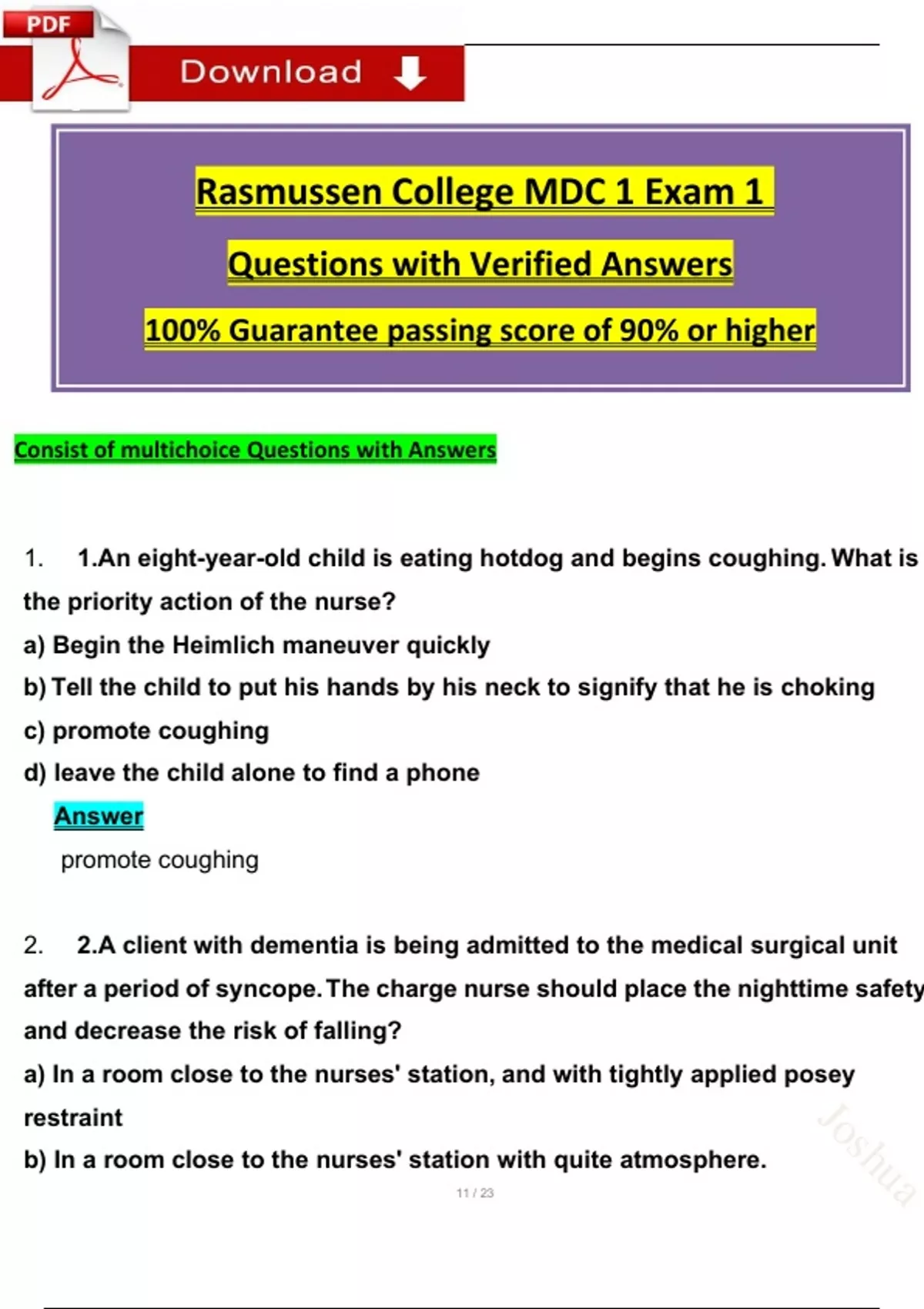 NUR 2356 / NUR2356: MDC 1 Exam 1 + Final Exam: ALL IN ONE (2025 / 2026) Questions with Revised Answers - Rasmussen College