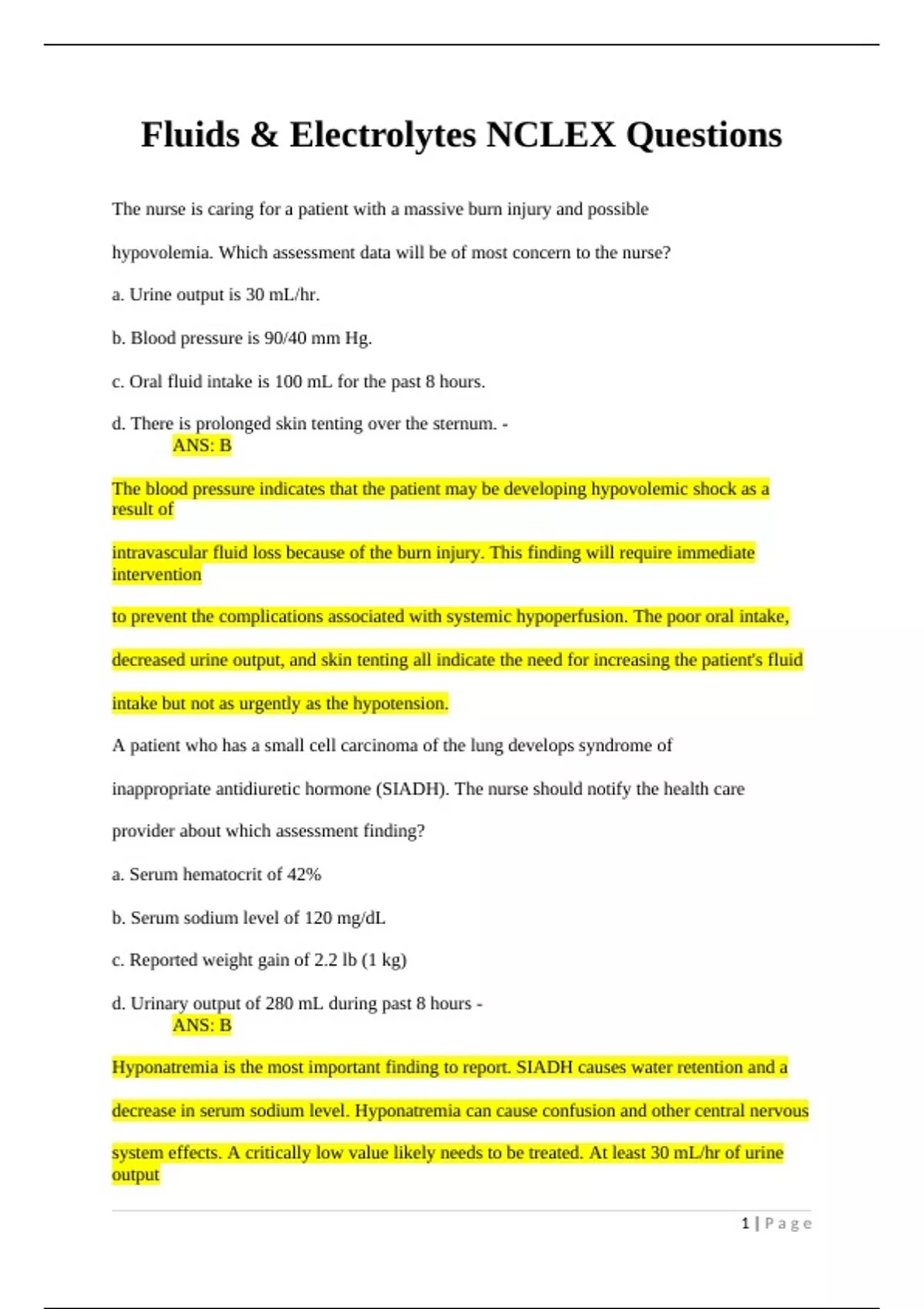 Fluid and Electrolytes Questions, Fluid and Electrolytes NCLEX Questions
