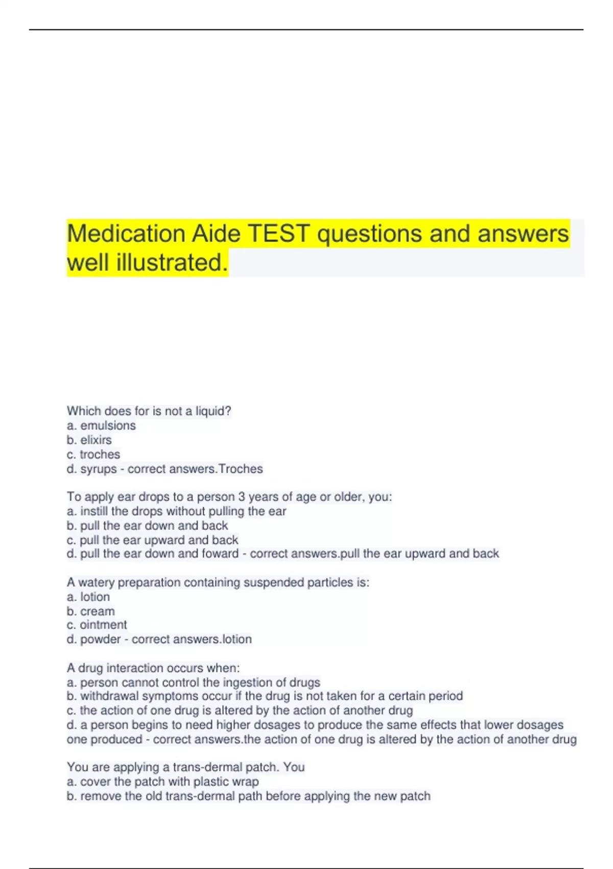 Certified Medication Aide Study Guide Chapters 7-9 Questions And Answers Latest Top Score.Certified Medication Aide Practice Exam questions and answers latest top score.Medication Aide TEST questions and answers well illustrated.Certified Medication Aide Practice Exam questions and answers latest top score.