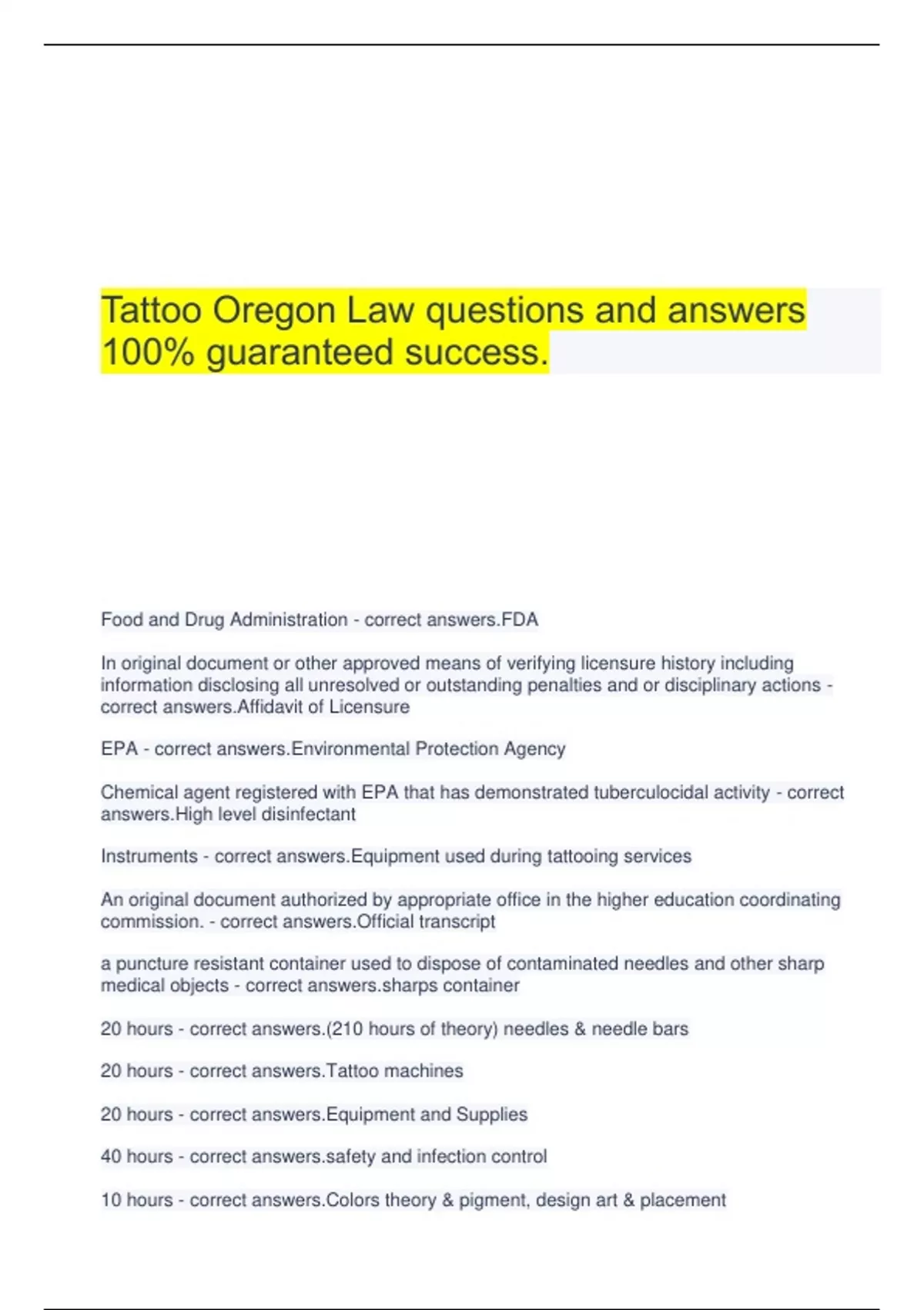 Oregon Law Esthetics Verified And Updated 2025.Esthetics Oregon Law Questions And Answers Latest Top Score.Tattoo Oregon Law questions and answers 100% guaranteed success.Esthetics - Oregon Law - Multiple Choice Questions And Answers Latest Top Score.