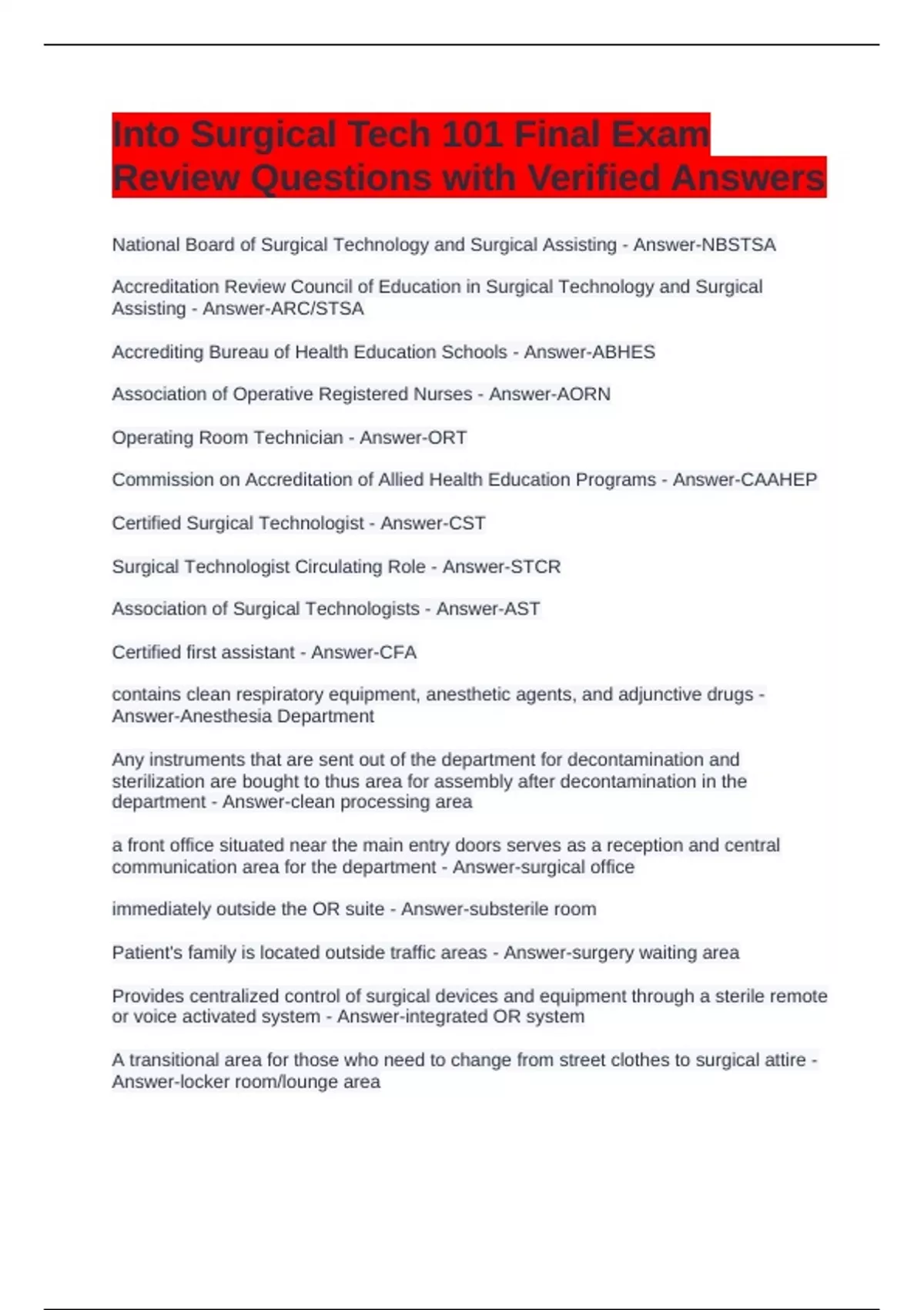 Exam (elaborations) Ch 1 - Intro to Surgical Technology Exam Questions and Answers Exam (elaborations) Fundamental of Surgical Technology Final Exam Review Questions and Answers Exam (elaborations) Into Surgical Tech 101 Final Exam Review Questions with Verified Answers Exam (elaborations) Surg Tech Exam 1 Questions and Answers Exam (elabo