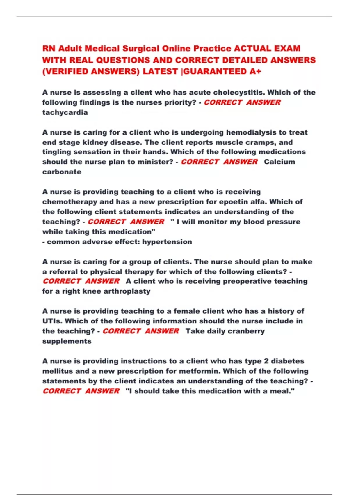 1 Exam (elaborations) RN Adult Medical Surgical Online Practice ACTUAL EXAM WITH REAL QUESTIONS AND CORRECT DETAILED ANSWERS (VERIFIED ANSWERS) LATEST |GUARANTEED A+ 2 Exam (elaborations) RN Adult Medical Surgical Online Practice ACTUAL EXAM WITH REAL QUESTIONS AND CORRECT DETAILED ANSWERS (VERIFIED ANSWERS) LATEST |GUARANTEED A+ 3 Exam (elaborat