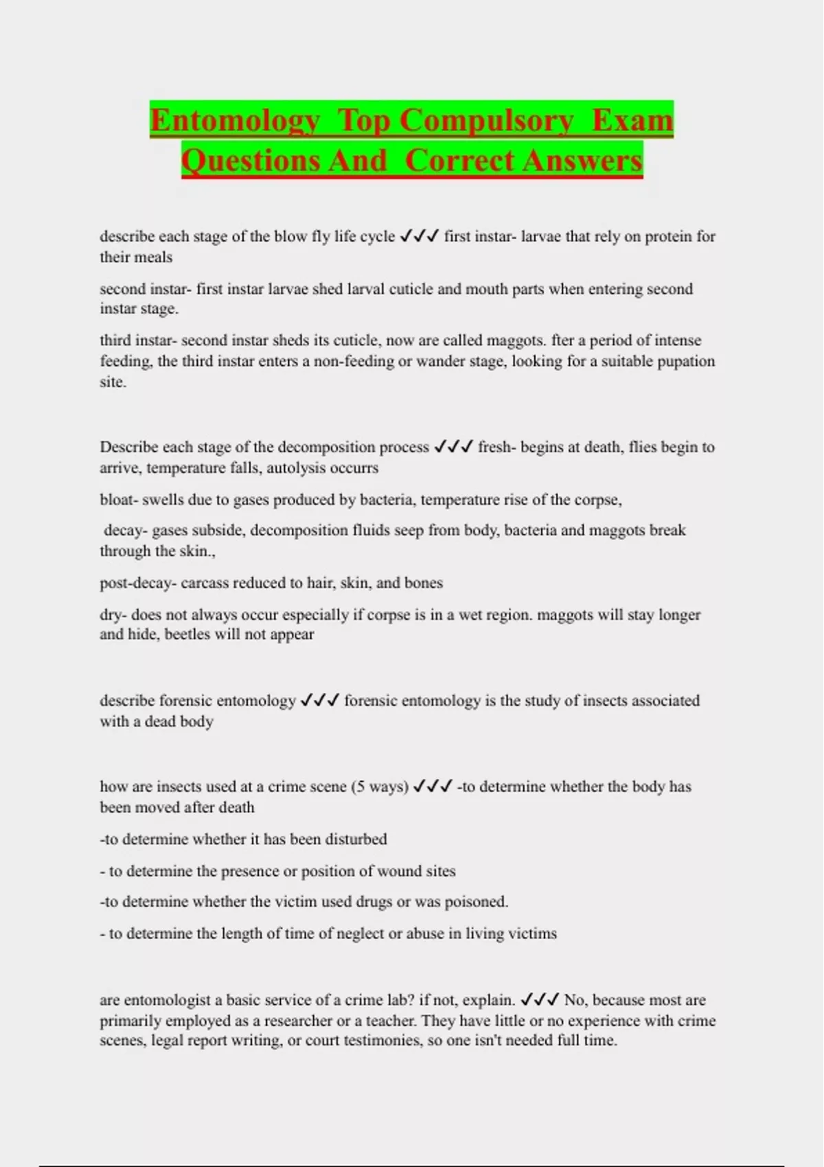 Entomology Bundled Exam Questions and CORRECT Answers
