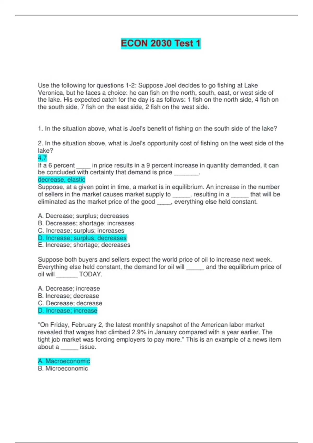 ECON 2030 TEST 1 AND FINAL EXAM PACKAGE