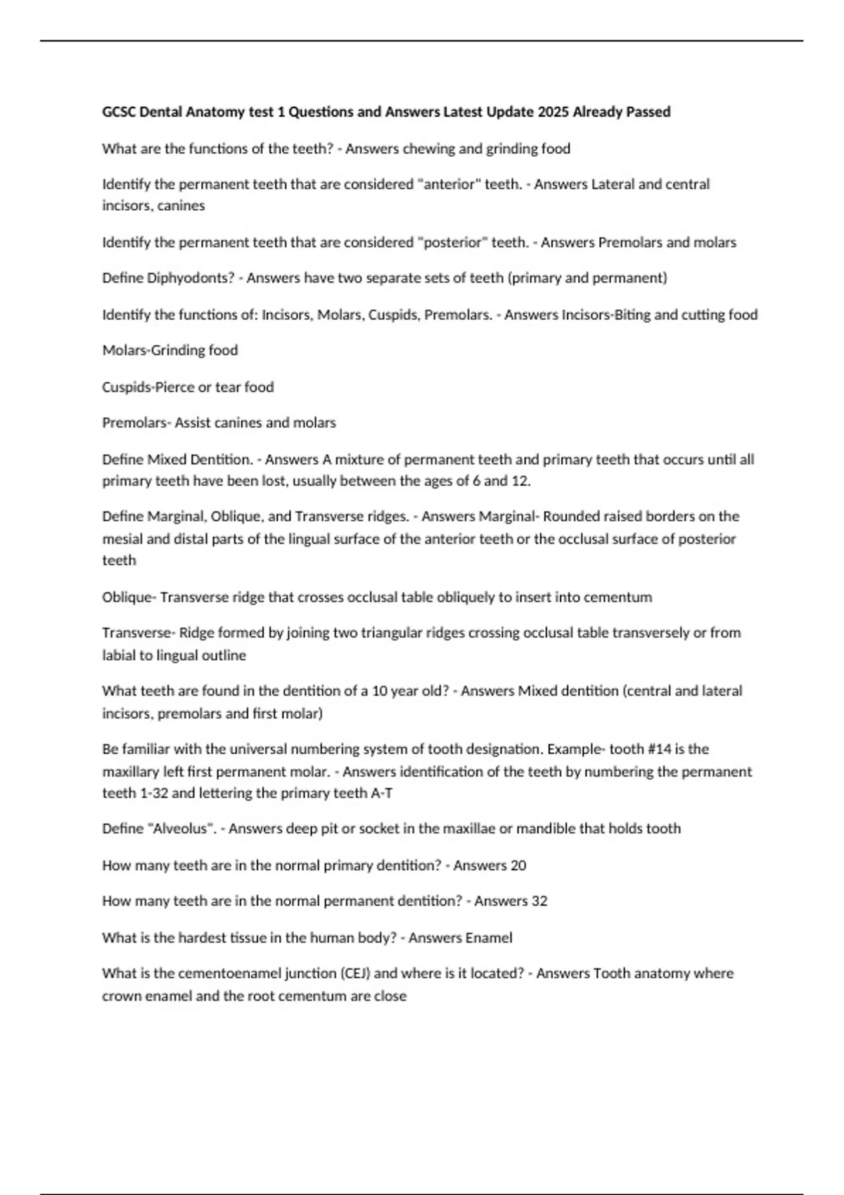 GCSC Dental Anatomy test 1 Questions and Answers Latest Update 2025 Already Passed