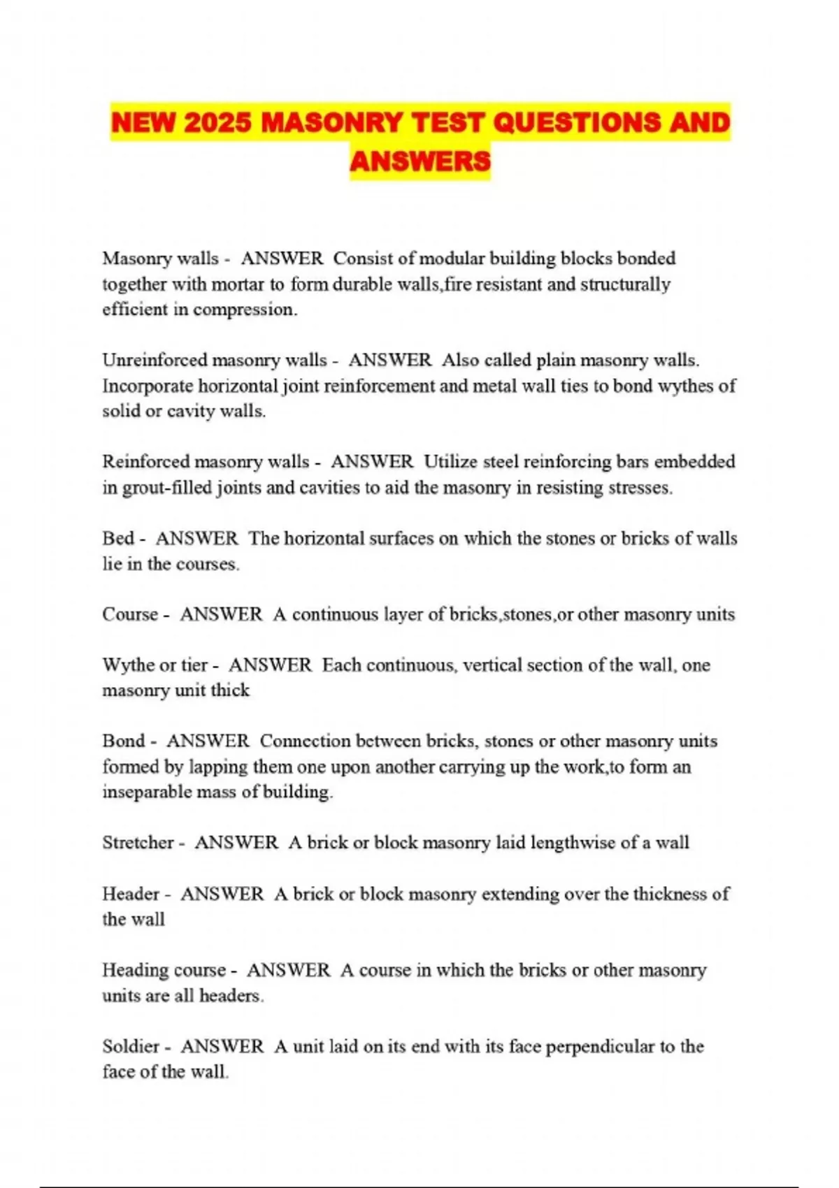 MASONRY EXAM STUDY GUIDE QUESTIONS WITH VERIFIED ANSWERS