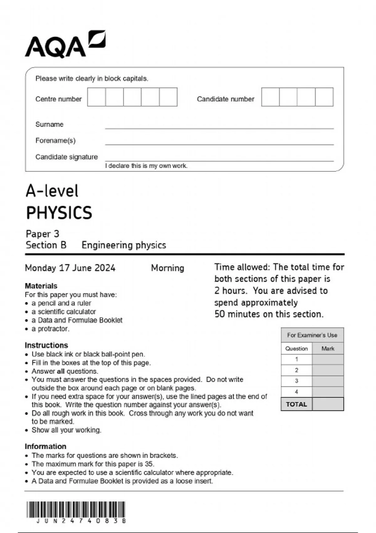 AQA A LEVEL PHYSICS 2024 PAPER 3 SECTION B ENGINEERING PHYSICS QUESTION PAPER AND MARKSCHEME