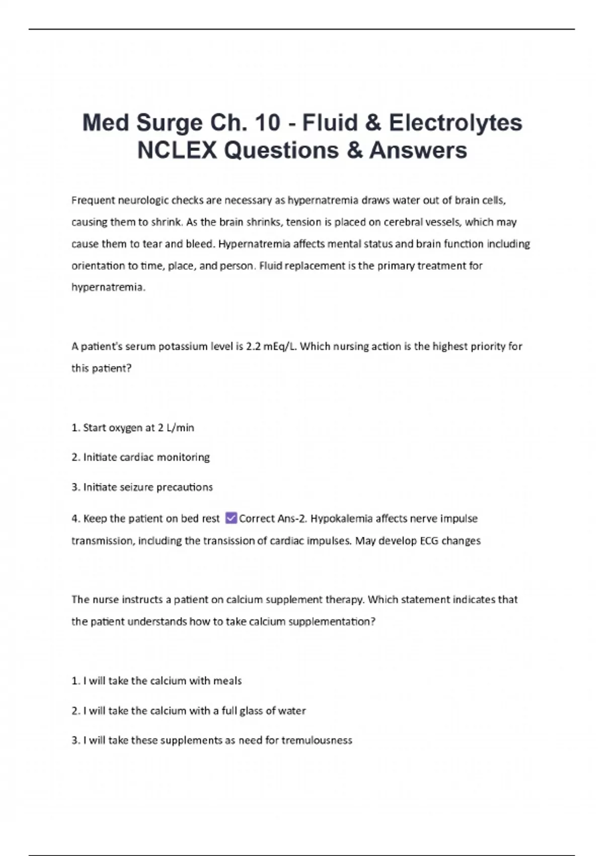 Med Surge Ch. 10 - Fluid & Electrolytes NCLEX Questions & Answers 100% Solved 2 Exam (elaborations) MED SURGE HESI V2; Questions & Answers 3 Exam (elaborations) MED SURGE HESI V2; Questions with Correct Answers|Latest Update