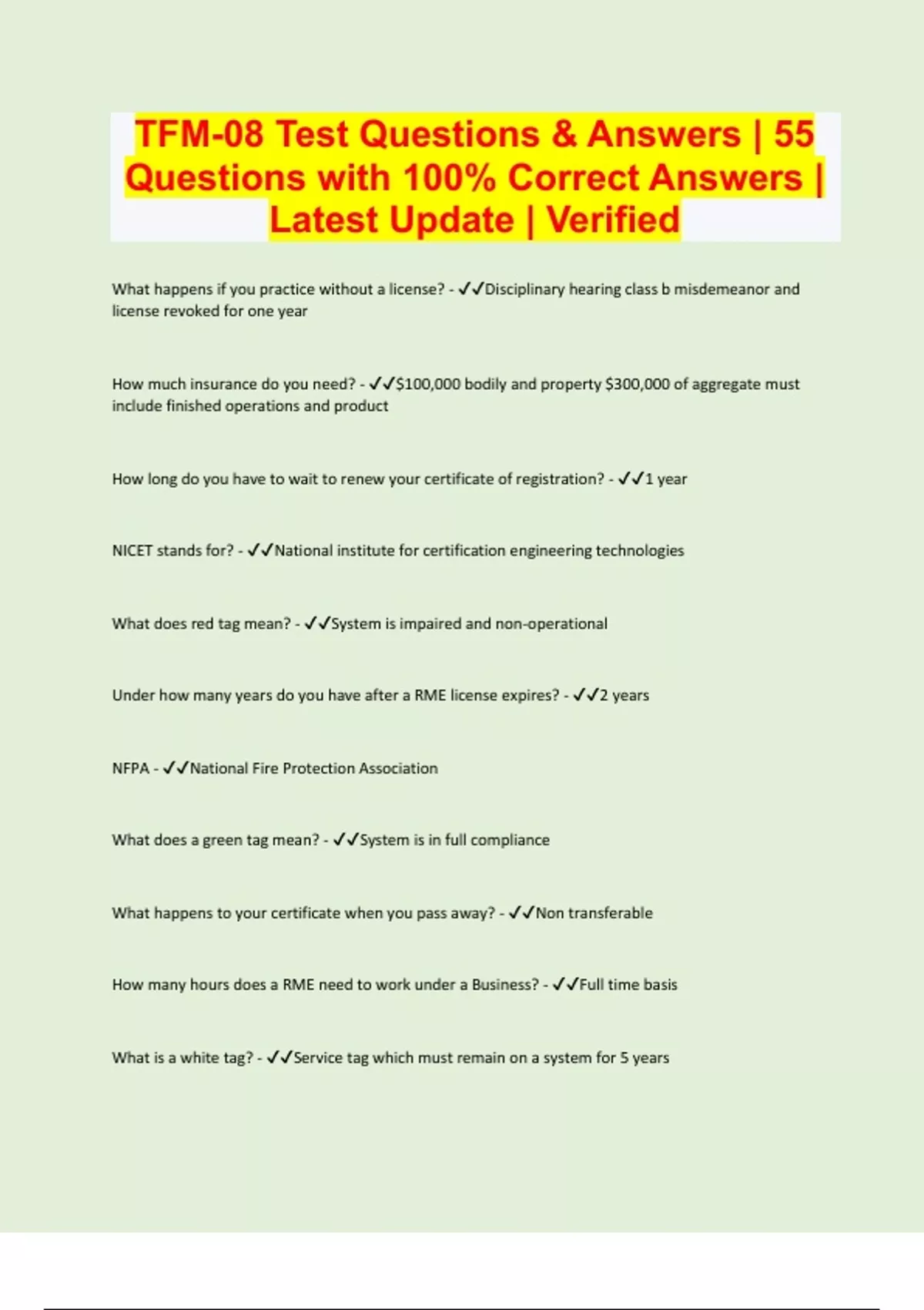 TFM08 the fire sprinkler rules Questions and Answers| Latest Update 2 Exam (elaborations) TFM-08 Test Questions & Answers | 55 Questions with 100% Correct Answers | Latest Update | Verified 3 Exam (elaborations) TFM-08 Questions and Answers| Latest Update