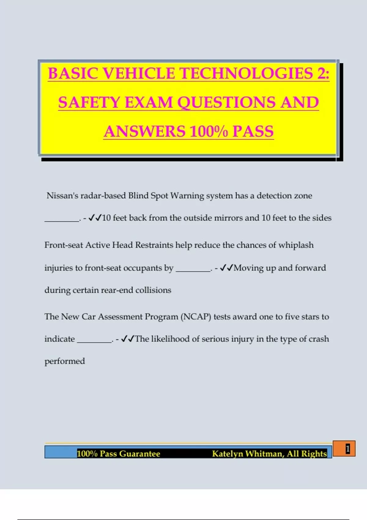 BASIC VEHICLE TECHNOLOGIES 2: SAFETY EXAM QUESTIONS AND ANSWERS 100% PASS