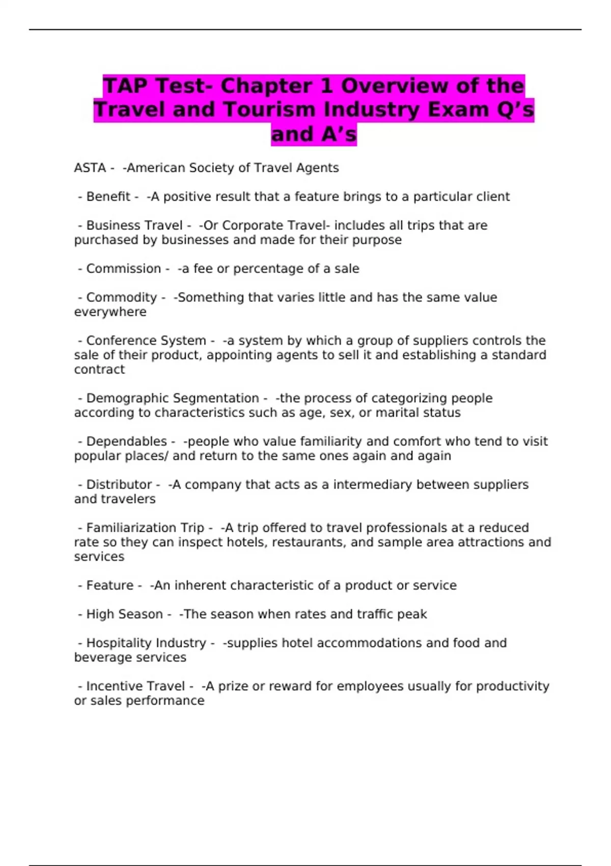 TAP Test- Chapter 1 Overview of the Travel and Tourism Industry Exam Q’s and A’s