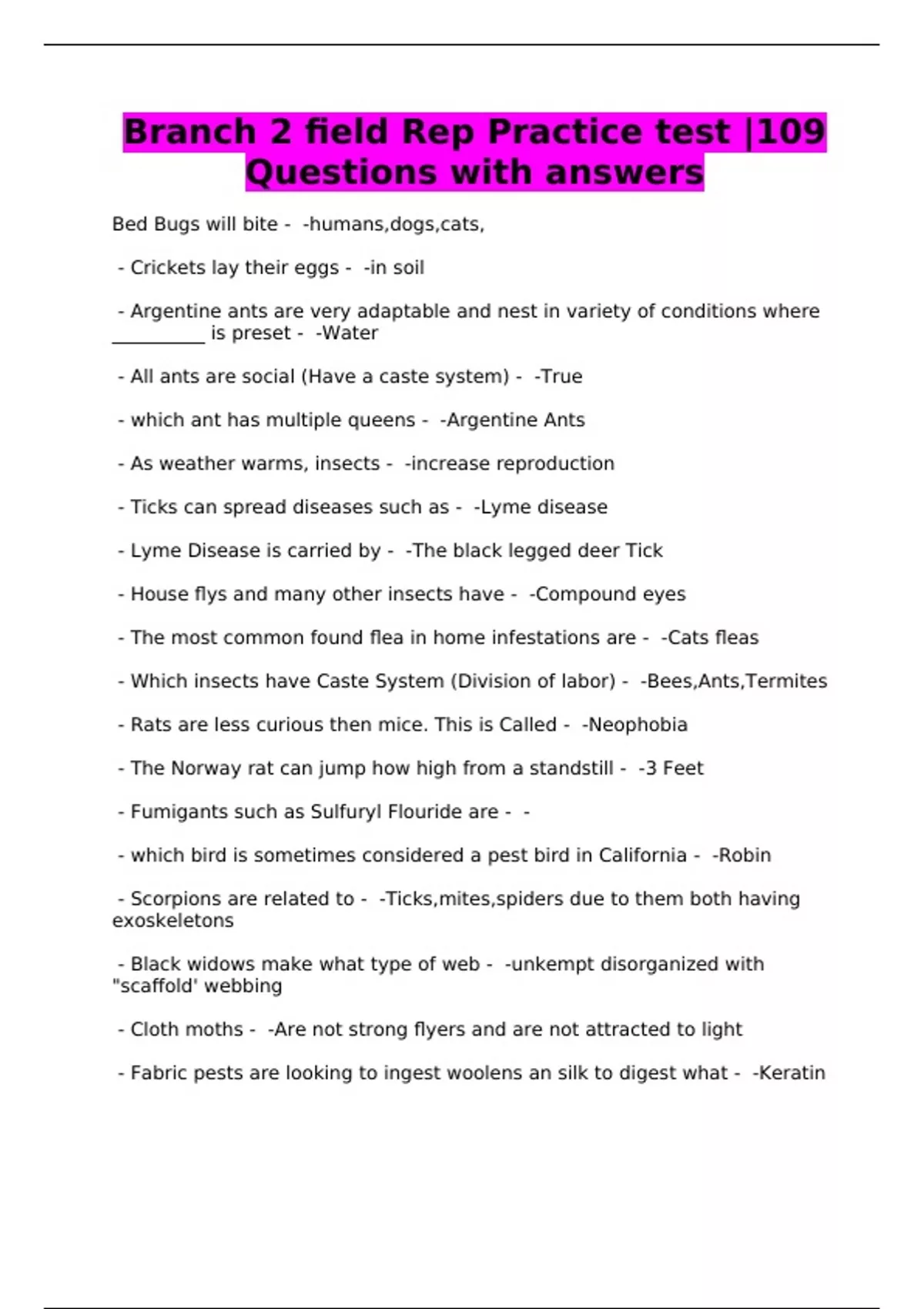Structural Pest Control Board Branch 2 Field Rep Exam Q’s and A’s