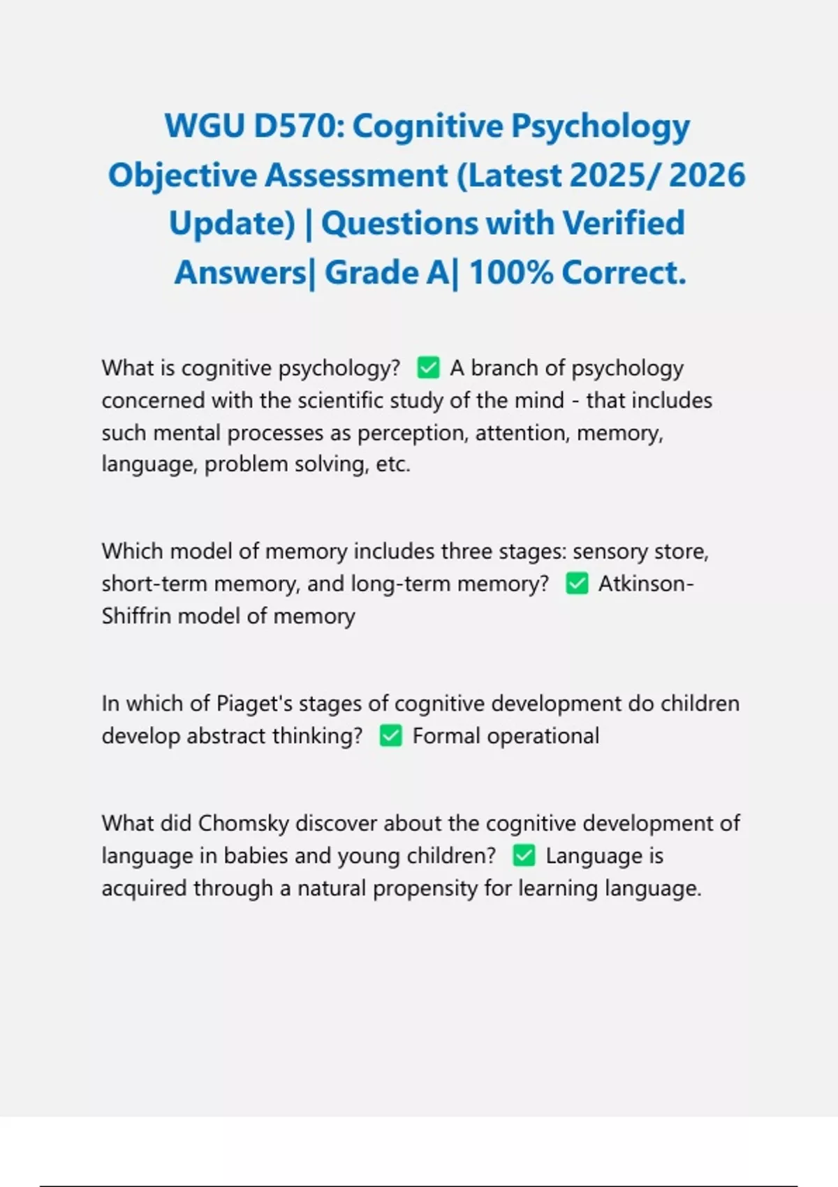 WGU D570/ WGUD570: Cognitive Psychology Exams PACKAGE DEAL| BUNDLE contains the Latest 2025/2026 OA exam, practice test, test bank, prep quiz and updated study guide - Everything you need to pass WGU D570 is here!!