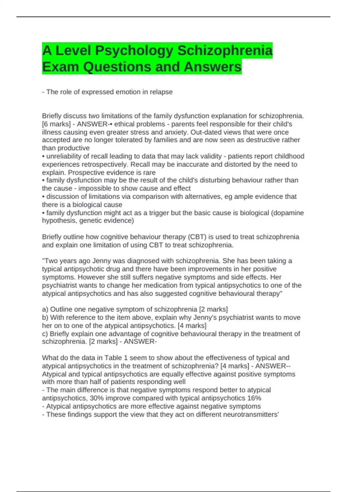 A Level Psychology Schizophrenia Exam Questions and Answers