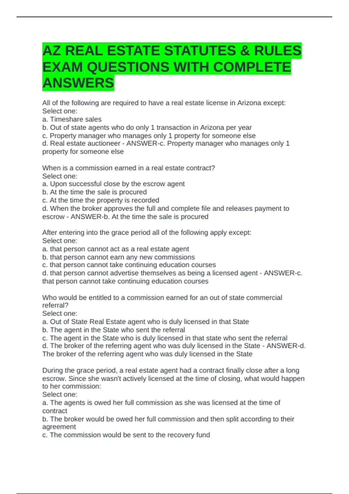 AZ REAL ESTATE STATUTES AND COMMISSIONER RULES EXAM QUESTIONS WITH COMPLETE SOLUTIONS 2 Exam (elaborations) AZ REAL ESTATE STATUTES AND COMMISSIONER RULES EXAM QUESTIONS WITH COMPLETE SOLUTIONS 3 Exam (elaborations) AMERICAN REALTY ACADEMY EXAM QUESTIONS WITH CORRECT ANSWERS 4 Exam (elaborations) AMERICAN REALTY ACADEMY EXAM QUESTIONS WITH CORRE