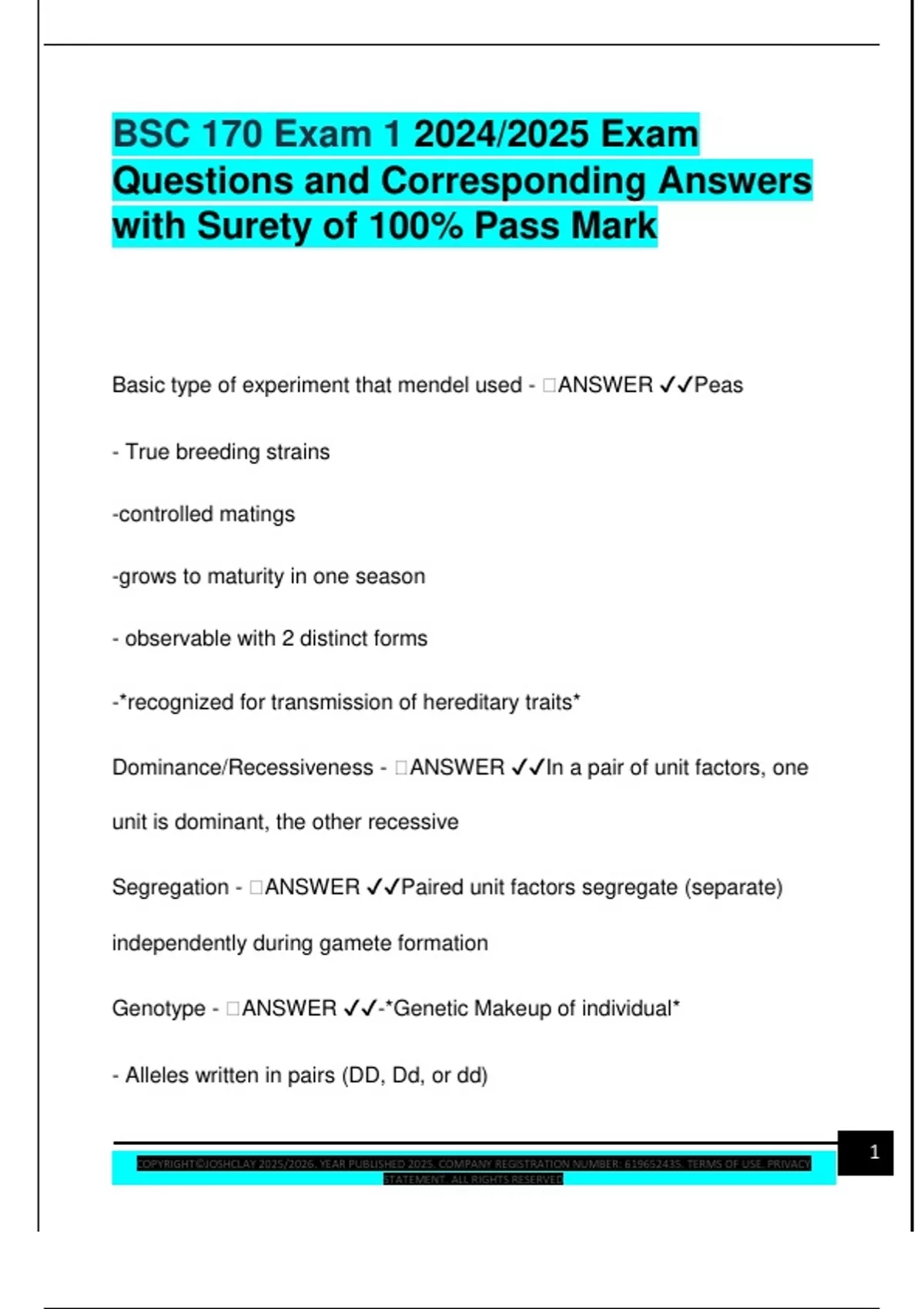 BSC 170 Exam 1 2024/2025 Exam Questions and Corresponding Answers with Surety of 100% Pass Mark