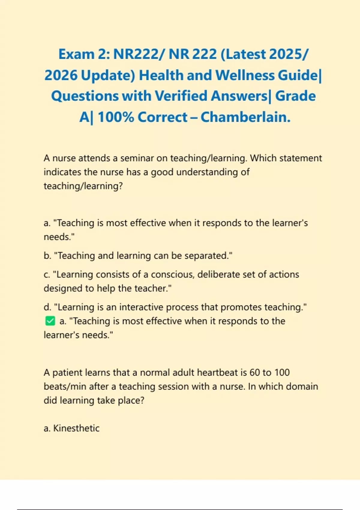 Exam 2: NR222/ NR 222 Health and Wellness PACKAGE DEAL | BUNDLE contains the Latest 2025/2026 Exam 2 and practice test with Verified Answers - Chamberlain