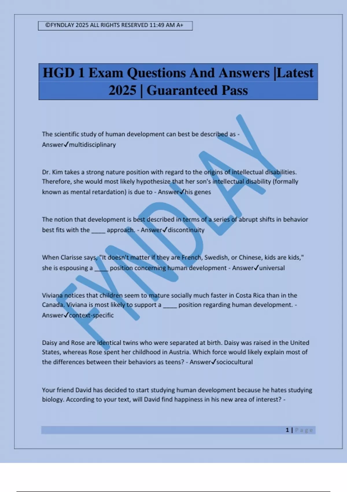 HGD Final Exam Questions And Answers |Latest 2025 | Guaranteed Pass