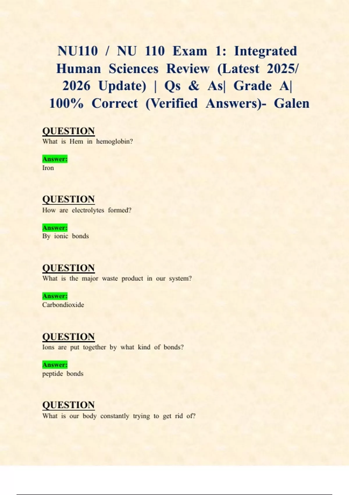 NU110 / NU 110 Exams 1: Integrated Human Sciences (Latest 2025/ 2026 Updates STUDY BUNDLE WITH COMPLETE SOLUTIONS) | Qs & As| Grade A| 100% Correct (Verified Answers)- Galen