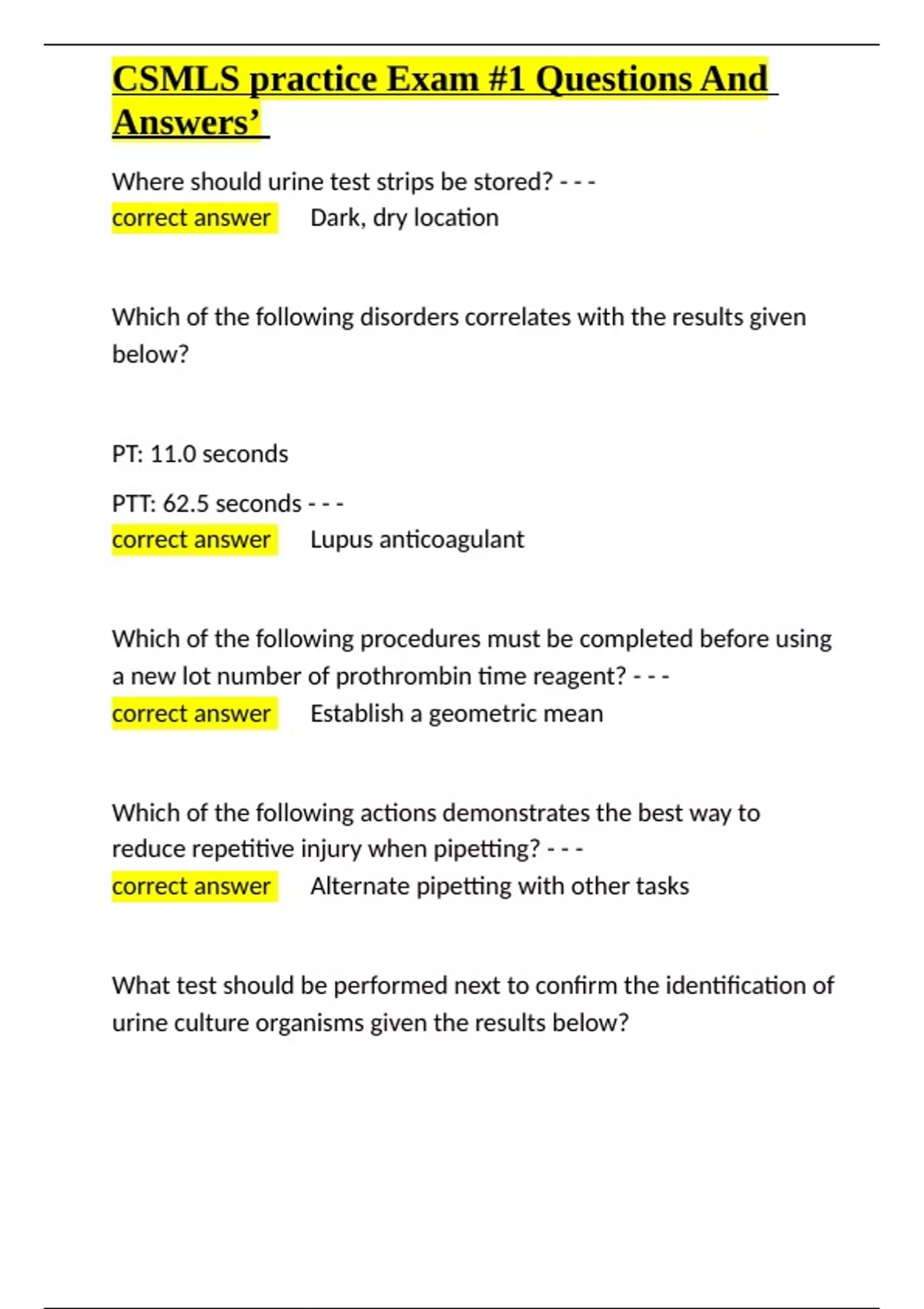 BAIP related information for CSMLS Exam Questions And Answers.docx Csmls competency profile Exam Questions And Answers.docx CSMLS practice Exam -1 Questions And Answers’.docx CSMLS MLA Practice Test 2 Exam Questions And Answers.docx MLAB 102 LECTURE 9 HPRAC, RHPA, CMLTO, CSMLS, OSMT EXAM QUESTIONS AND ANSWERS.docx CSMLS EXAM PREP QUESTIONS AND ANSW