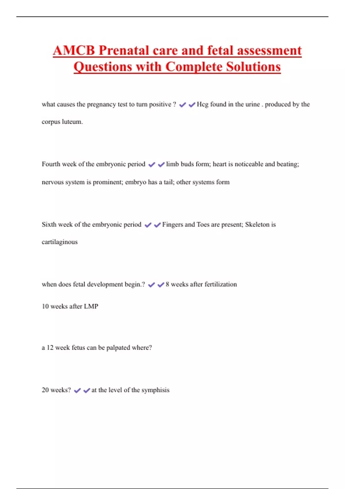 AMCB Prenatal care and fetal assessment Questions with Complete Solutions 2 Exam (elaborations) AMCB Practice Question Review with Complete Solutions