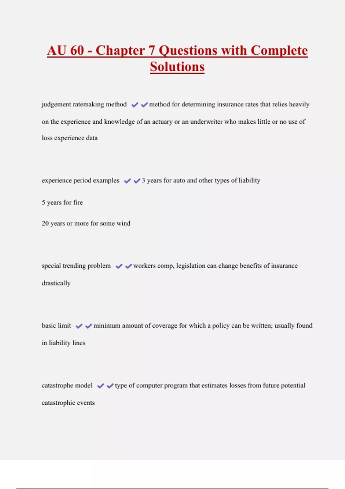 AU 60 - Chapter 7 Questions with Complete Solutions 2 Exam (elaborations) AU 60 - Chpt 2 Key Items Questions and Answers Verified by Experts 3 Exam (elaborations) AU 60 - Complete Set Questions and Answers 100% Solved 4 Exam (elaborations) AU 60 - Assignment 1 - Fundamentals of Underwriting Questions and Answers Verified by Experts