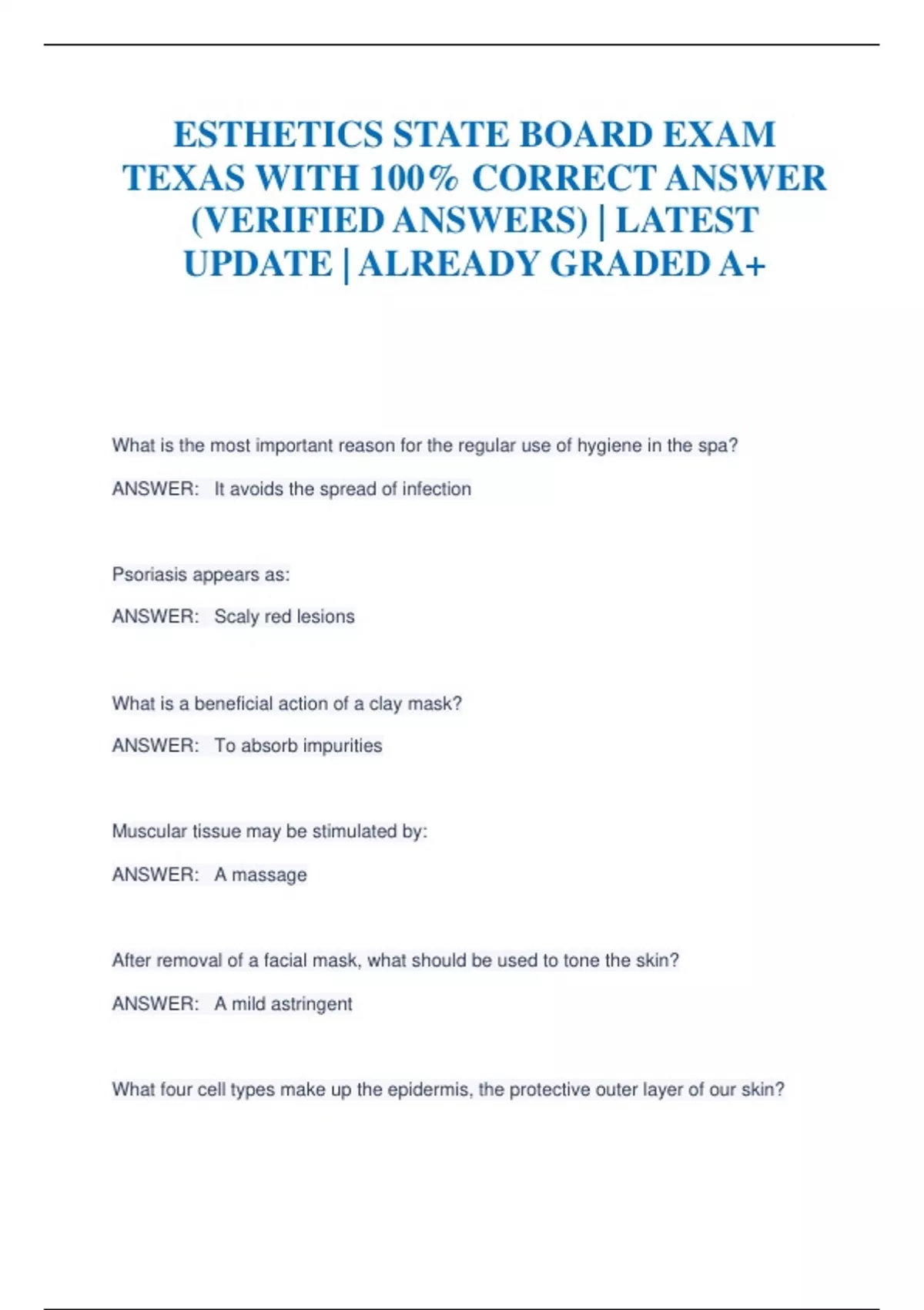 Esthetics State Board Laws Exam | Questions & 100% Correct Answers (Verified) | Latest Update | GradeA+