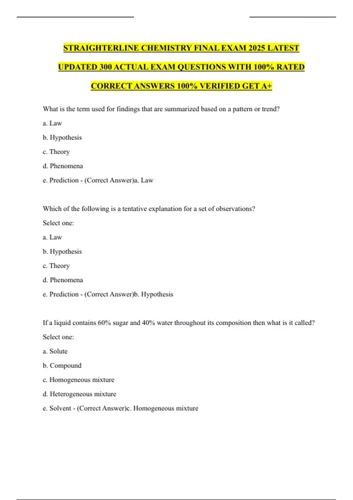 PACKAGE DEAL FOR CHEMISTRY STRAIGHTERLINE EXAM 2025 LATEST UPDATED 400+ ACTUAL EXAM QUESTIONS WITH 100% RATED CORRECT ANSWERS 100% VERIFIED GET A+