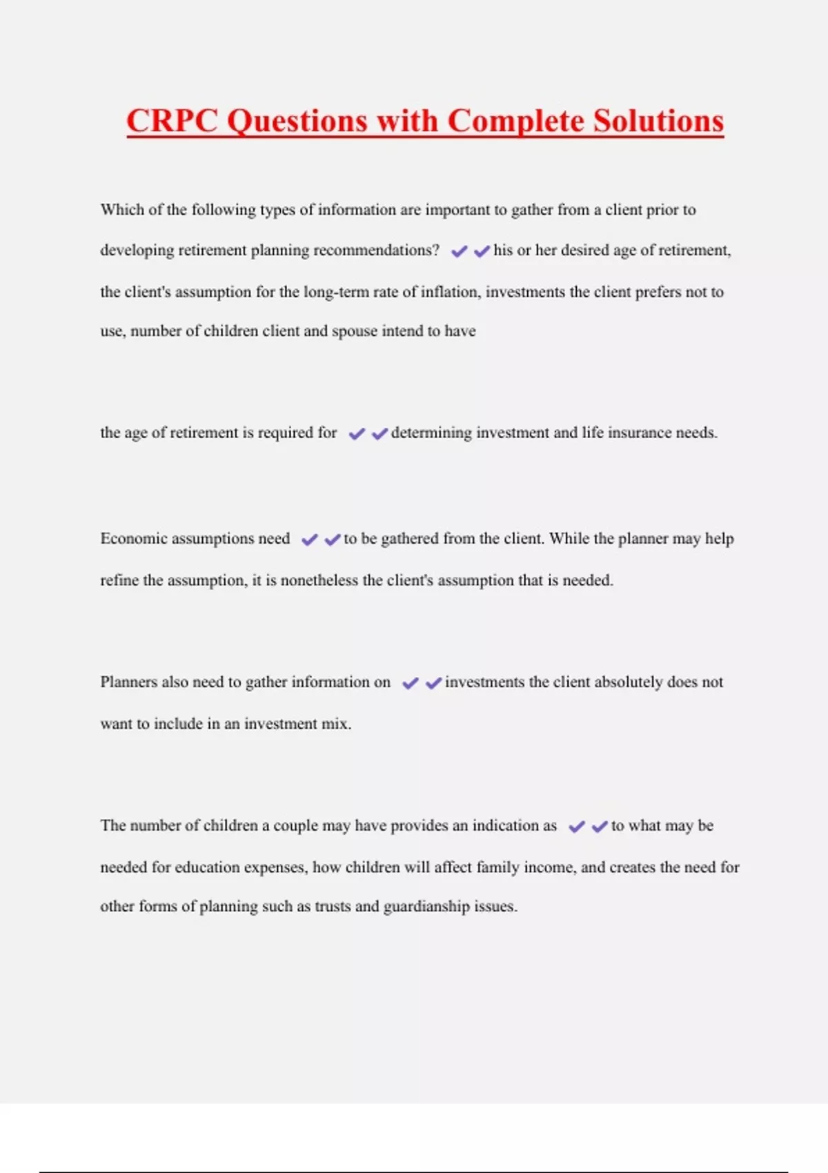 CRPC Questions with Complete Solutions 2 Exam (elaborations) CRPC Questions and Answers 100% Solved 3 Exam (elaborations) CRPC | Navigating Health Care Options in Retirement Questions with Complete Solutions 4 Exam (elaborations) CRPC Practice Exam 2 Questions with Complete Solutions 5 Exam (elaborations) Crpc You Got This Study Cards - Memoriz
